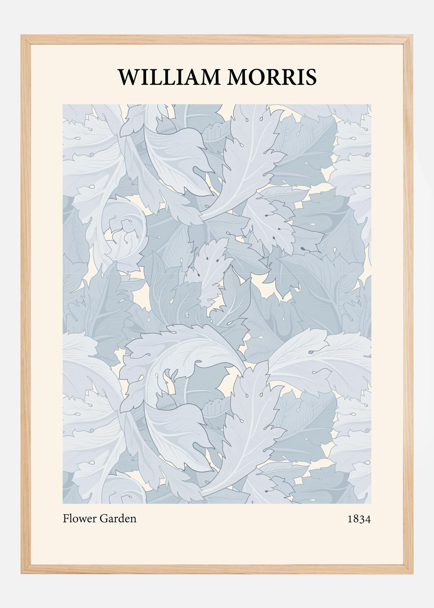 Med en atmosfär av lugn och elegans, presenterar denna William Morris affisch en symfoni av sirliga bladverk i en sval och rogivande färgskala. "Flower Garden" som titeln antyder, fångar essensen av en frodig och tyst trädgård genom sitt detaljerade bladmönster som flödar över ytan med en mjuk rytm. Färgpaletten är noga utvald för att återspegla naturens subtila skönhet och inkluderar himmelsblått, bladgrönt och bleka krämfärger, som tillsammans skapar en harmonisk och balanserad estetik.