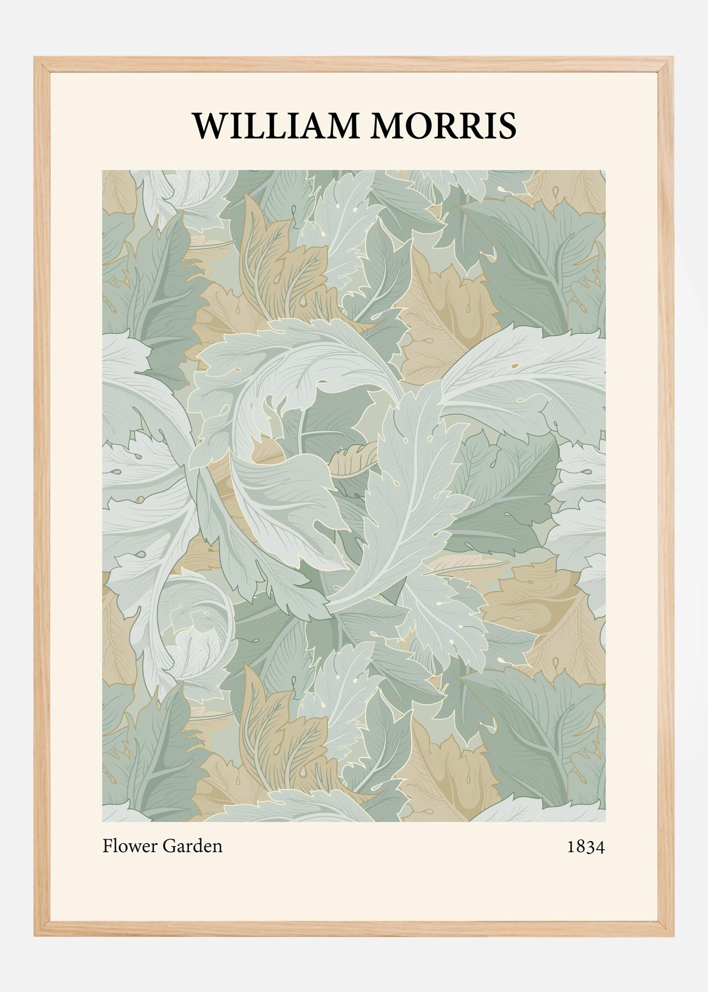 Denna eleganta och fängslande affisch är en hyllning till William Morris och hans oförglömliga bidrag till design och konst. Med sitt "Flower Garden"-motiv, presenterar denna print en sofistikerad komposition av bladverk och florala former som flätar samman i en färgpalett av lugnande blågröna och varma beiga toner. Varje element är utformat med Morris karakteristiska detaljrikedom, vilket skapar en känsla av djup och komplexitet som kan uppskattas vid varje blick.