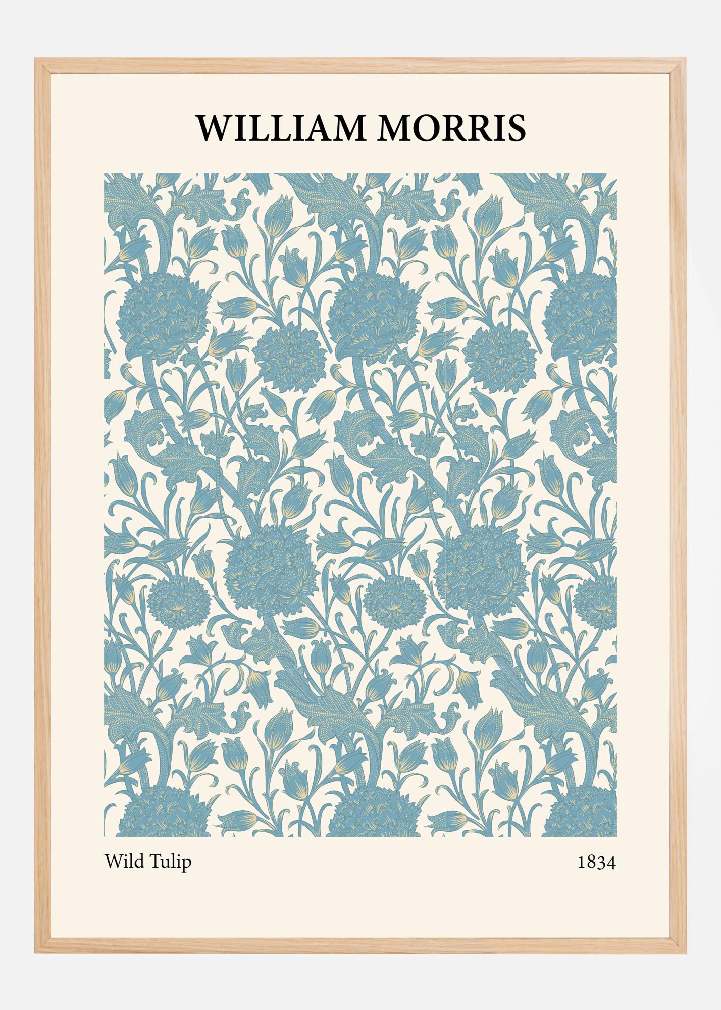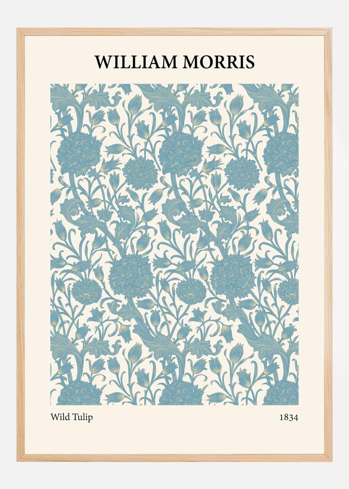 Denna William Morris-affisch, betitlad "Wild Tulip", är en levande representation av den brittiska Arts and Crafts-rörelsens kärlek till naturens detaljer och komplexitet. Det är en skönhet att skåda, med ett mönster av vilda tulpaner i ett spektrum av blå nyanser, från mjuka himmelsblå till intensiva midnattsblå, alla snyggt placerade mot en krämfärgad bakgrund som framhäver mönstrets finess.