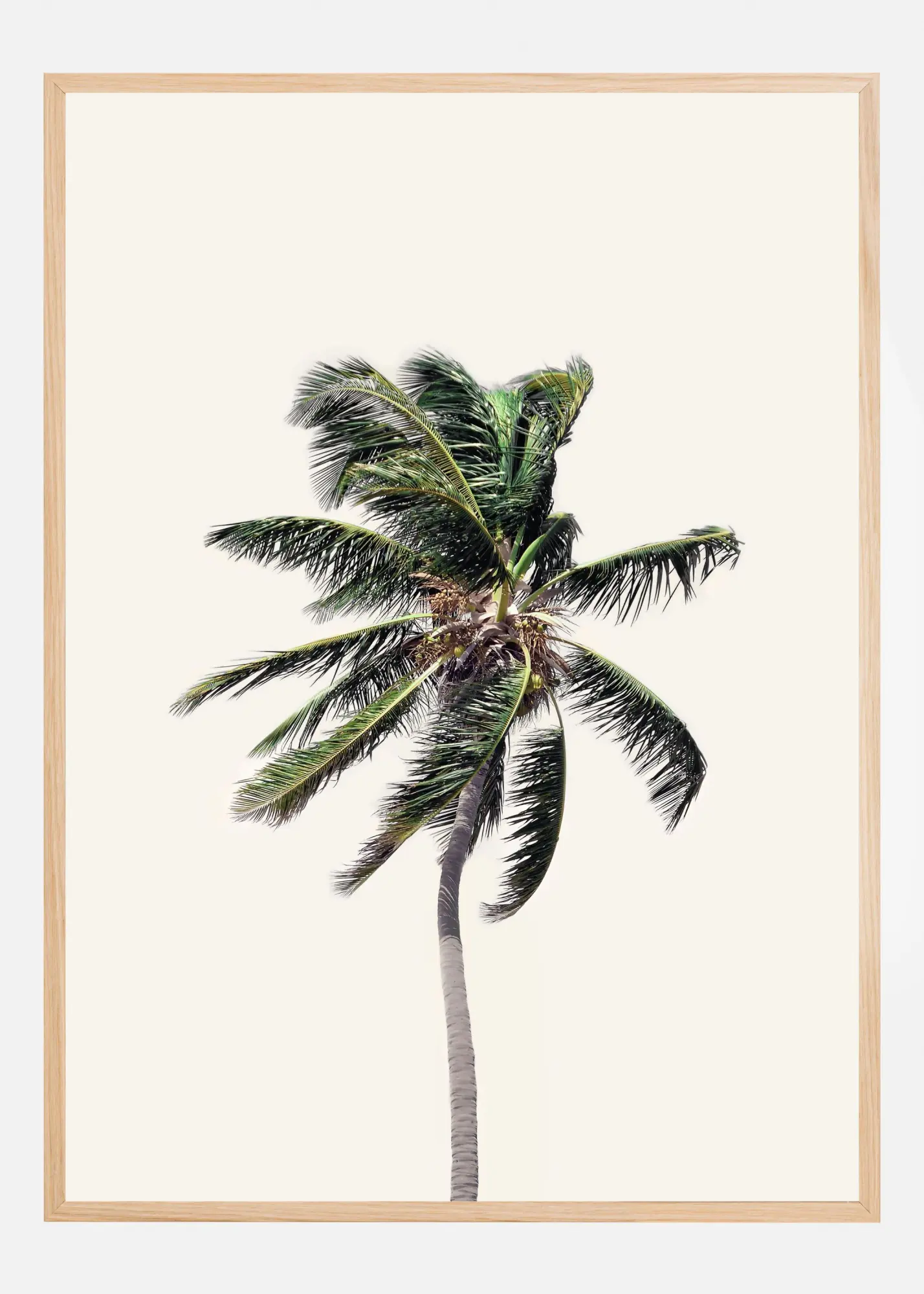 I affischen dominerar naturliga färgtoner, med djupgrönt i palmbladens livfulla nyanser kombinerat med bruna inslag i stammen. Den ljusa bakgrunden lyfter fram palmens skönhet och skapar en harmonisk balans i motivet. Oavsett var du väljer att placera denna print kommer den att dra blickarna till sig med sin enkla men eleganta charm.