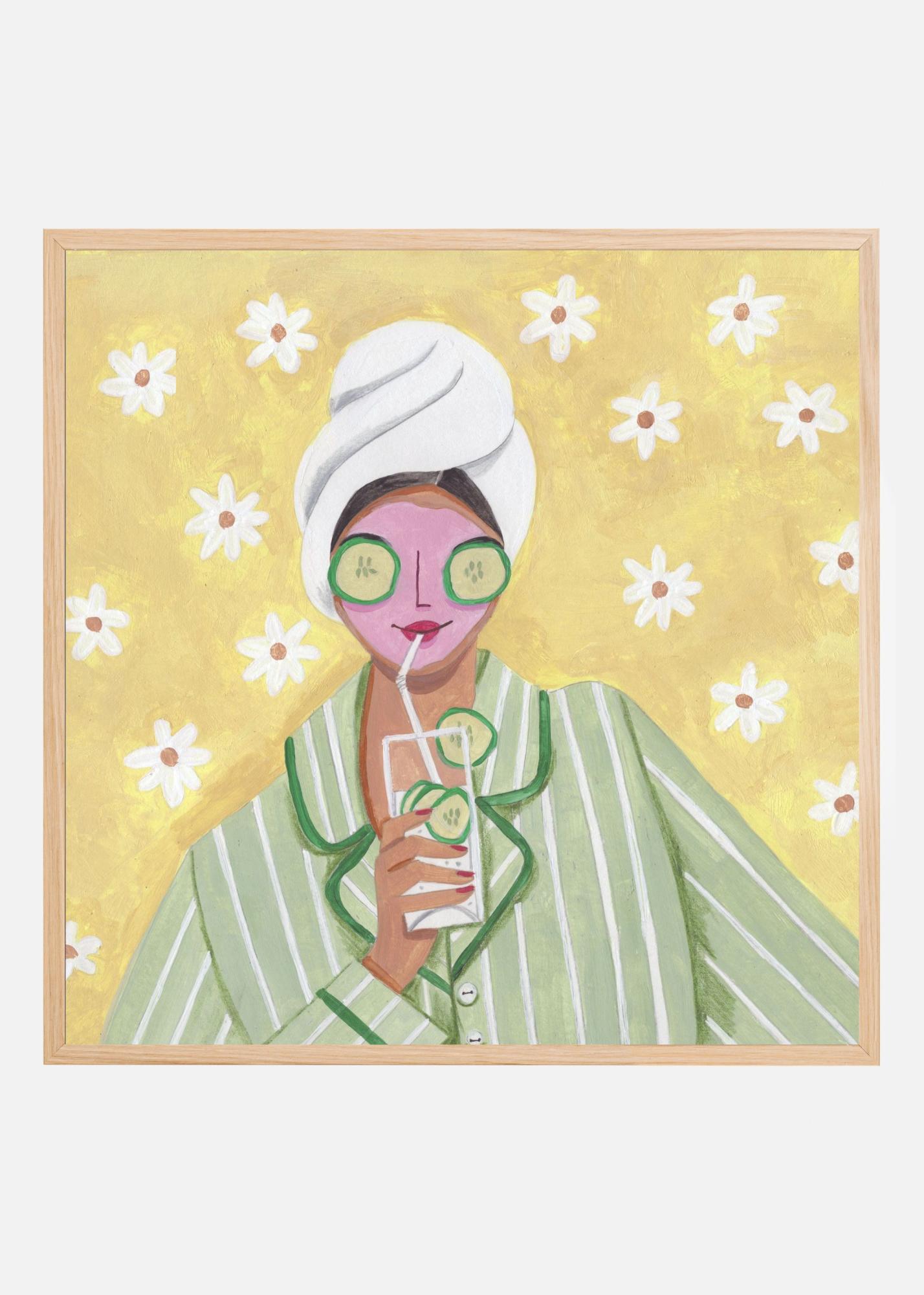 Denna trendiga poster fångar en avkopplande stund med en person insvept i en vit handduk och en grönrandig pyjamas, sippande på en drink med gurkskivor. Bakgrunden är fylld med vita prästkragar mot en solgul ton, vilket ger en fräsch och livlig känsla till motivet. Den rosa nyansen i ansiktet och de gröna gurkskivorna ger en härlig kontrast och skapar en livfull atmosfär.