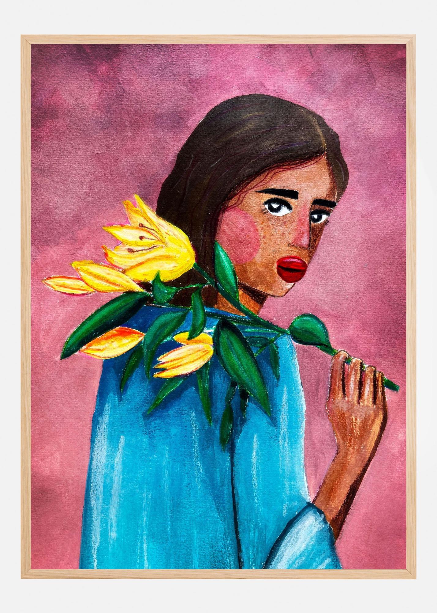 Denna färgstarka poster fångar ögat med sitt uttrycksfulla motiv av en kvinna som håller en bukett gula blommor. Med ett konstnärligt uttryck i sitt ansikte, speglar denna print både styrka och skönhet, vilket gör den till en perfekt inredningsdetalj för den trendmedvetna. Det dominerande blå plagget hon bär skapar en vacker kontrast mot de varma tonerna i bakgrunden och blommorna, vilket gör att det här motivet sticker ut i vilket rum som helst.