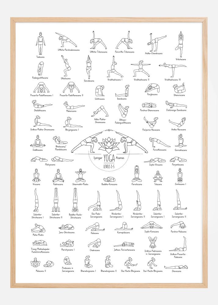 Den centrala delen av postern är dedikerad till Iyengar Yoga Asanas för nivå 1-5, vilket indikerar en progression i praktiken. Denna print är inte bara funktionell utan också estetiskt tilltalande, och passar utmärkt i en yogastudio, ett hemmagym, eller som en inspirationskälla i en avslappnande hörna av hemmet. Dess minimalistiska svart-vita design gör den kompatibel med en rad olika inredningsstilar, samtidigt som den sprider en känsla av lugn och fokus.