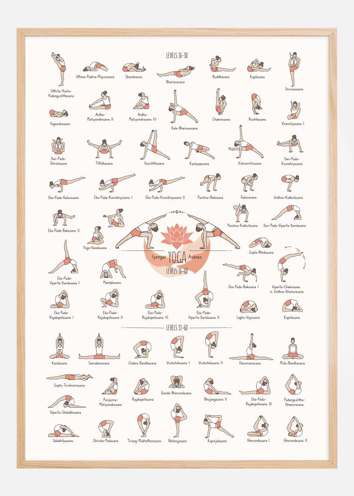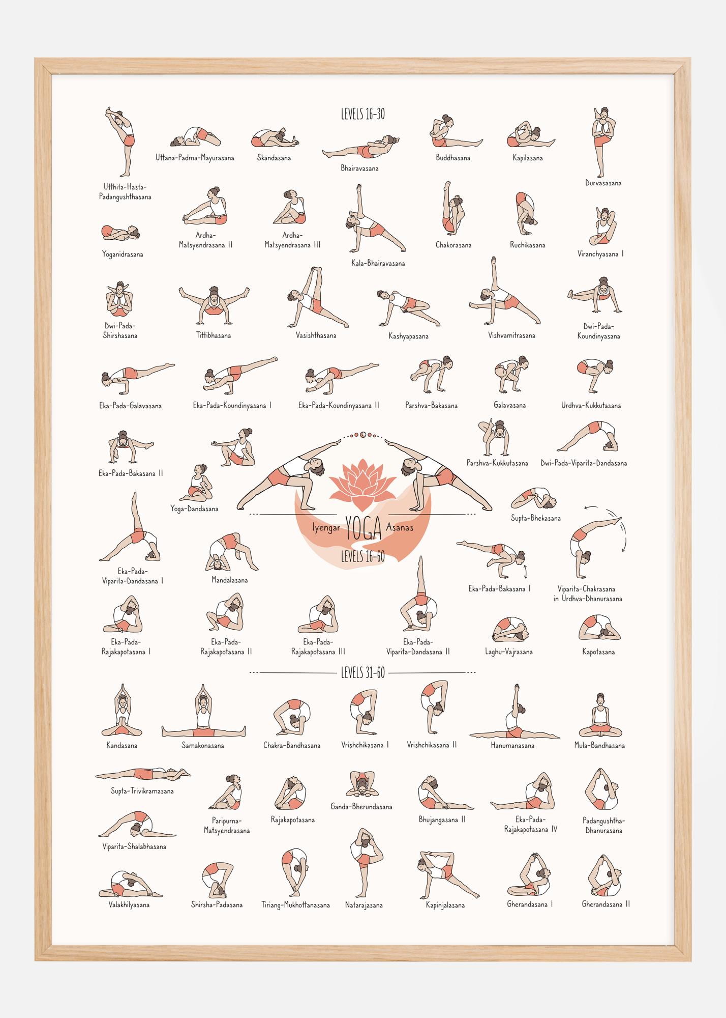 Denna färgstarka och instruktiva poster är en guide till Iyengar Yoga Asanas, riktad till de på mellanliggande till avancerade nivåer, nivåerna 16 till 30. Asanorna är illustrerade med en palett av jordnära färger som framhäver varje positions unika form och struktur. Övningarna är noggrant numrerade och namngivna på sanskrit för att tillgodose en bred publik.