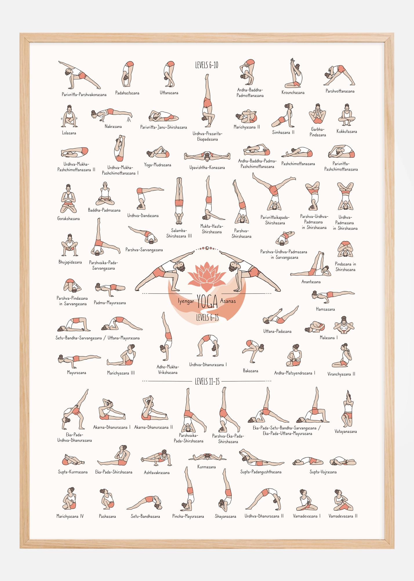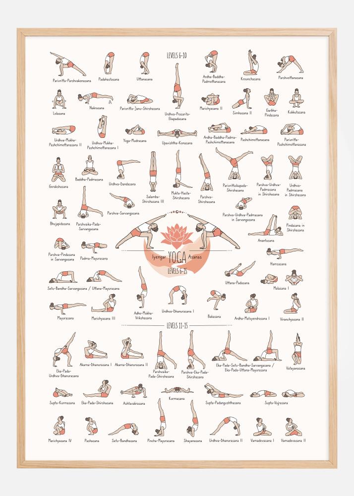 Denna detaljerade och färgglada yoga poster illustrerar en omfattande samling av Iyengar Yoga asanas från nivå 6 till 15. Varje yogaposition är fint illustrerad med varma, behagliga färger som framhäver varje form och gest, samtidigt som de tydligt identifierbara namnen intill varje illustration gör det enkelt att följa och praktisera. Designen är både funktionell och estetisk, och skapar en inbjudande atmosfär för yogautövare av alla kunskapsnivåer.