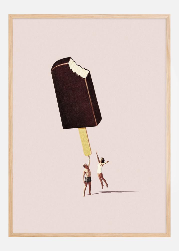 Den här charmiga affischen visar en unik och lekfull bild av två personer som tycks ha hittat en gigantisk glasspinne! Med sin fantasifulla komposition och en varm pastellrosa bakgrund erbjuder denna bild en känsla av sommarglädje och nostalgi. De glada figurerna, klädda i enkla badkläder, sträcker sig efter glasspinnen, som har ett realistiskt utseende med en bit tagen ur den, vilket skapar en härlig kontrast mot den minimalistiska omgivningen. Denna kreativa och livliga scen fångar betraktarens uppmärksamhet och väcker minnen från soliga dagar.
