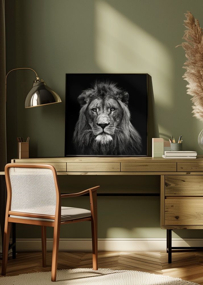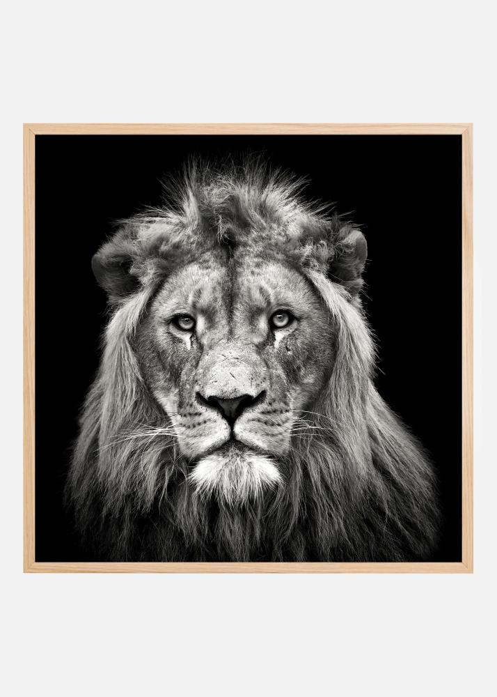 Denna poster fångar den majestätiska närvaron hos ett lejon, en symbol för styrka och skönhet. Det dramatiska svartvita motivet framhäver lejonets uttrycksfulla ansikte och dess ståtliga man, vilket gör det till ett elegant tillskott till vilken vägg som helst. Perfekt för den som vill ha en kraftfull och tidlös bild i sitt hem.