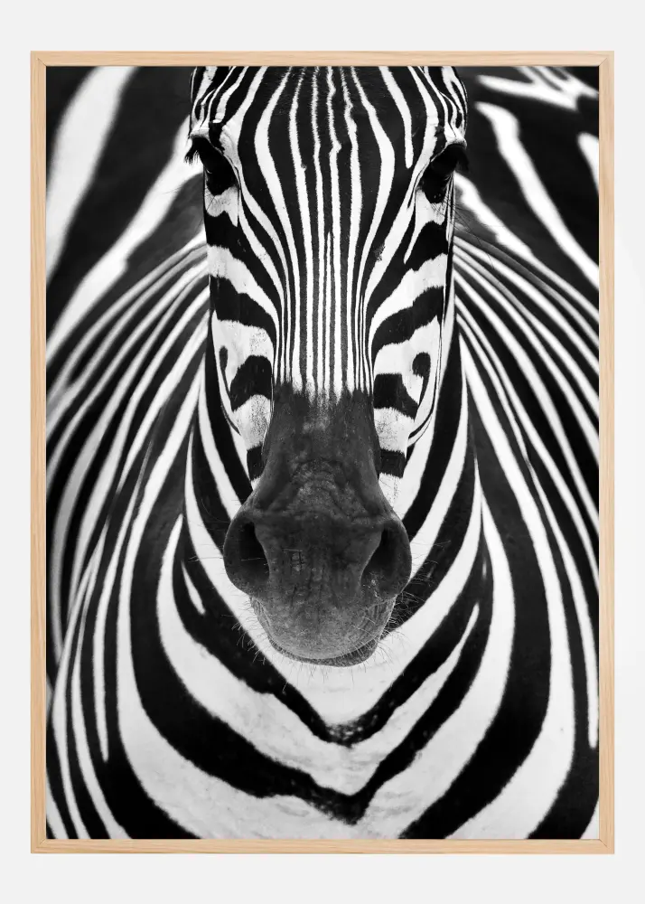 En fantastisk djurposter med en zebra som vänder sig mot kameran. Lägg till några starka former i ditt hem och matcha den här häpnadesväcknade postern med en ljust färgad vägg för en verkligt abstrakt konstkänsla.