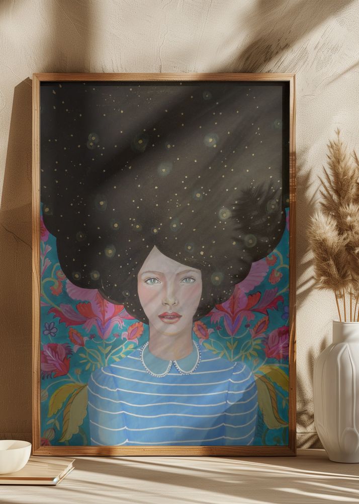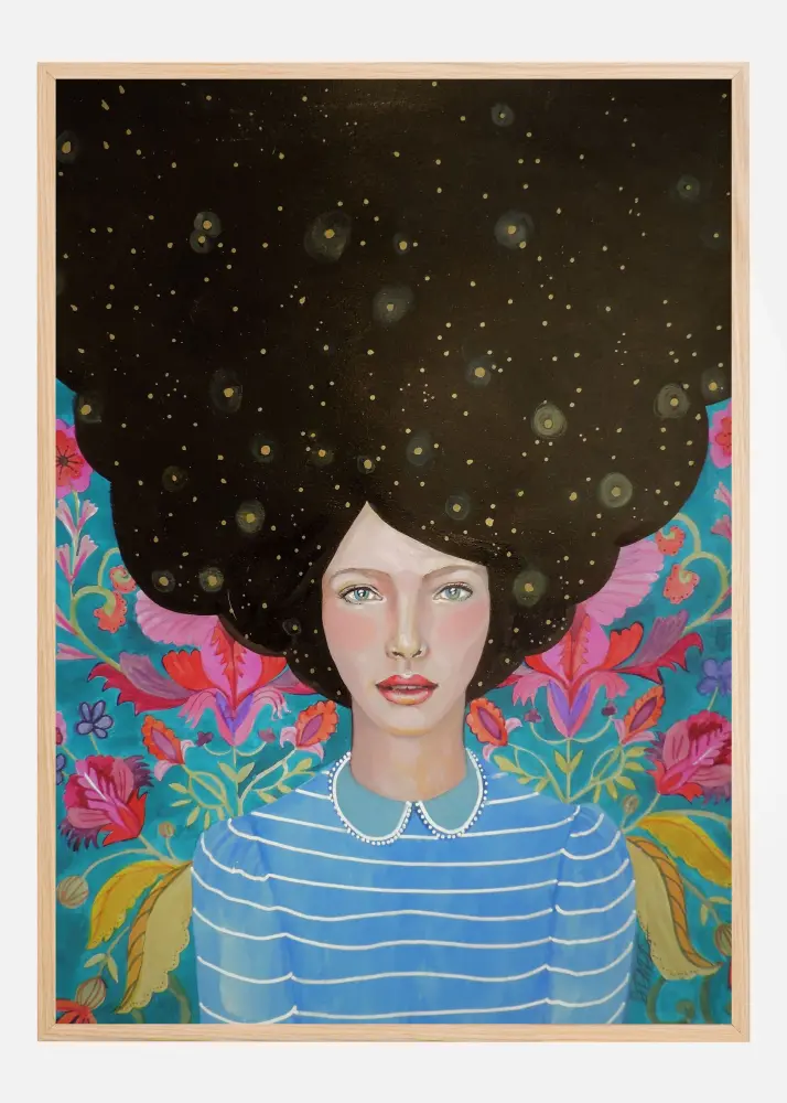 Upptäck denna unika och trendiga poster som porträtterar en stiliserad dam med en iögonfallande och fantasifull tolkning av hennes hår, vilket övergår i en stjärnklar natthimmel. Den här konstfulla affischen kombinerar element av surrealism och mode, med en personlig prägel som gör att den passar perfekt i ett modernt hem. Färgpaletten består av jordnära toner av grönt och rosa som kontrasterar vackert mot den midnattsblå natthimlen och den mjölkljus hudtonen, vilket skapar en harmonisk balans i bilden.