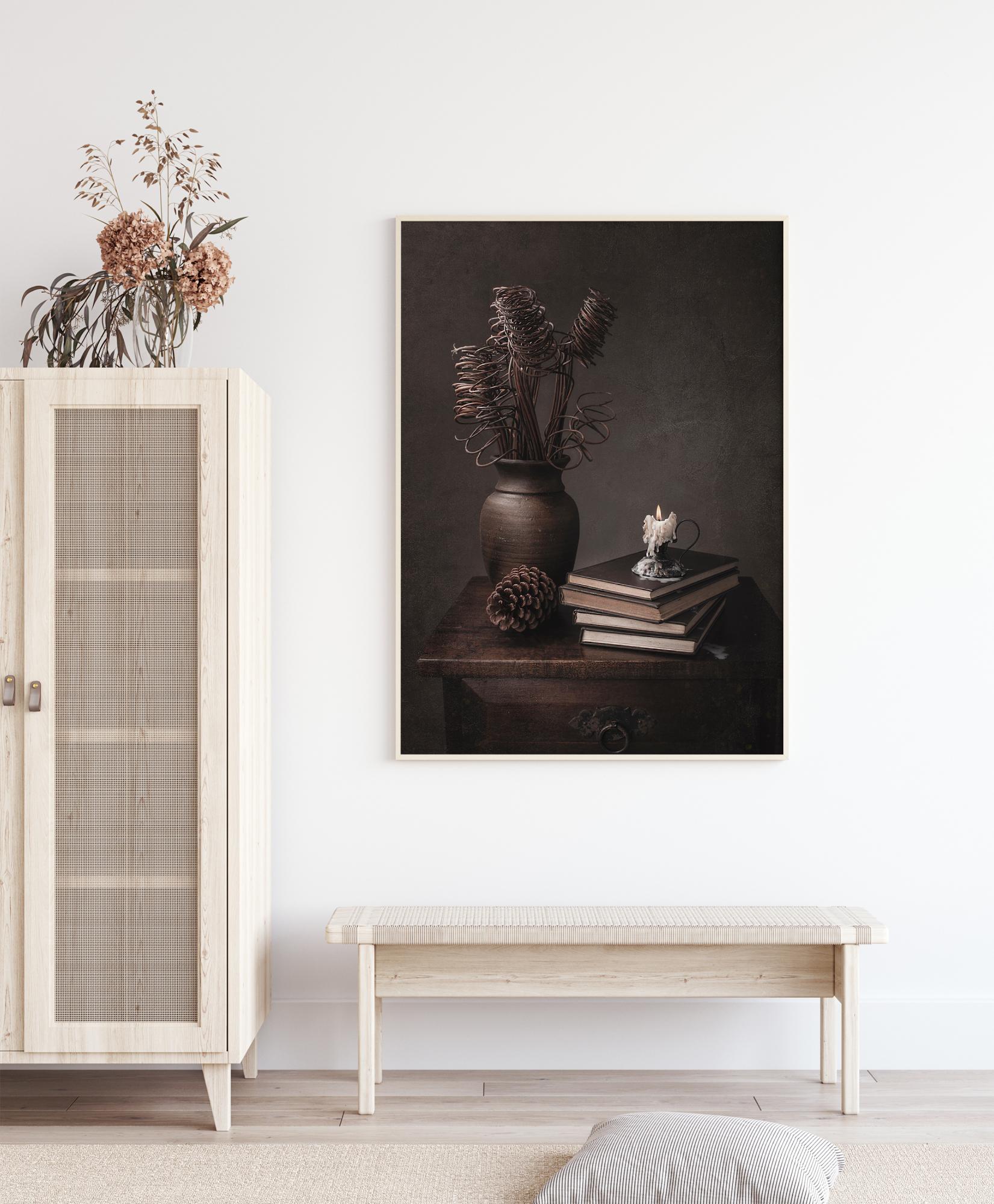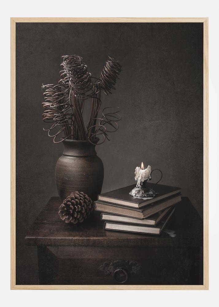 En dramatisk stillebenposter med en kanna, en tallkotte, böcker och ett ljus på en gammal byrå. Den torra växtens spiraler drar blicken till det smältande vaxet och ljuslågan. De mörka sepiafärgerna ger en mystisk känsla av en tid i det förflutna.