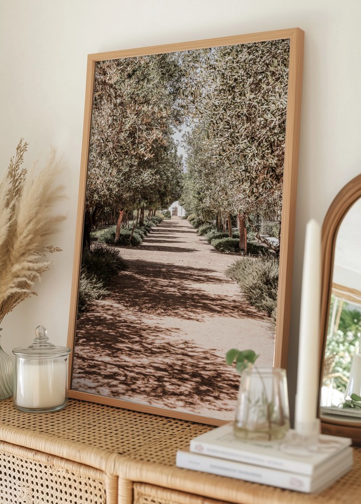 Motivet domineras av mjuka jordnära toner, där beige och brunt harmoniskt kombineras med grönskande nyanser i trädens lövverk. Ljuset spelar en central roll och adderar en touch av värme och romantik, vilket gör denna affisch till ett idealiskt tillskott för dem som söker inredningsdetaljer med naturlig skönhet.