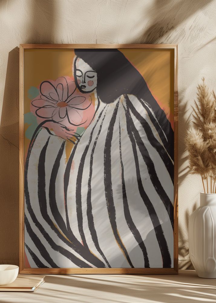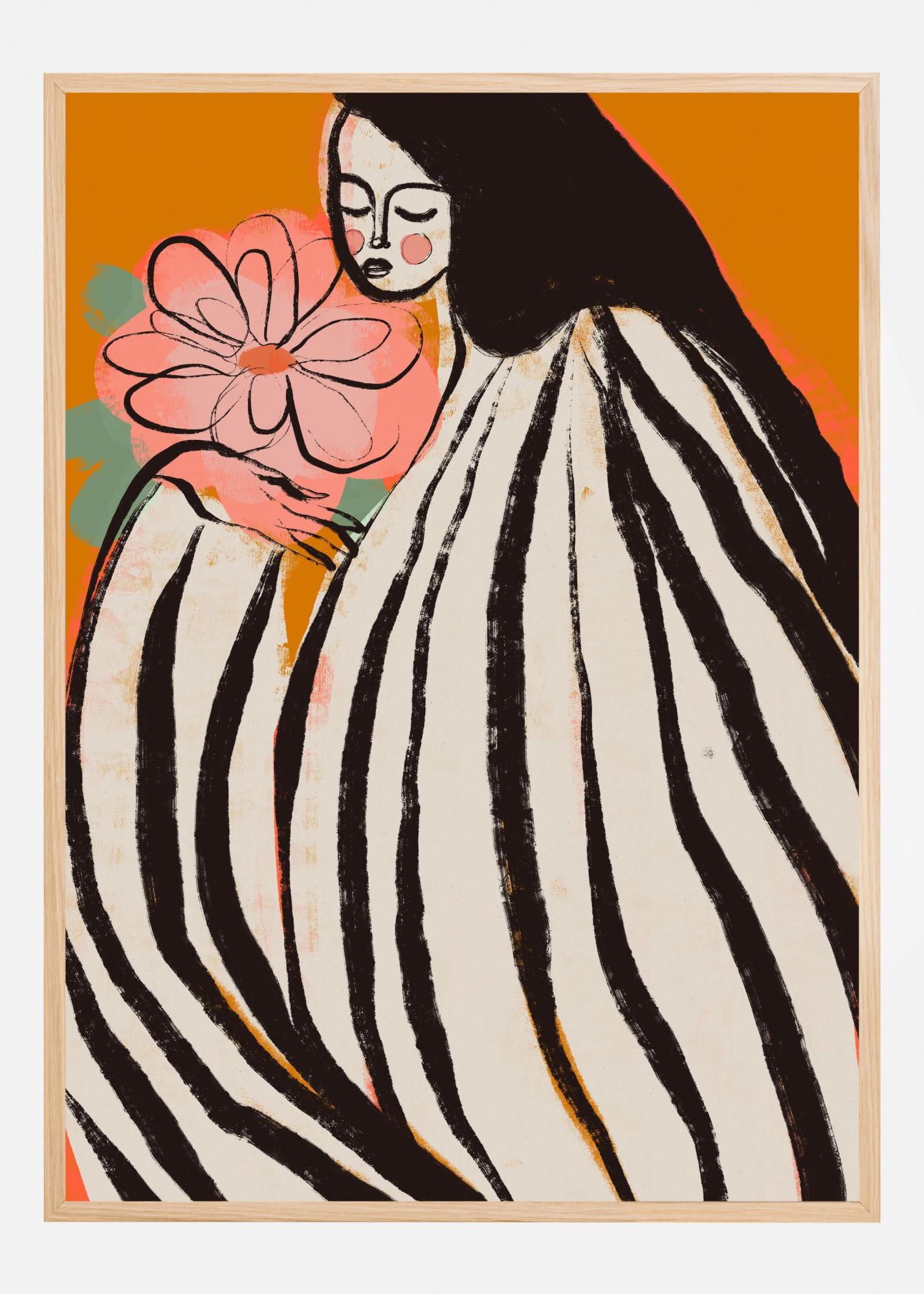 För att addera en modern och konstnärlig touch till ditt hem, kan denna unika poster vara precis det du letar efter. Den framställer en stiliserad figur omfamnande en stor blomma, där kontrasten mellan den abstrakta mänskliga formen och det organiska motivet skapar en fängslande komposition. Printen är en lek med texturer och kurvor, och erbjuder en samtida tolkning av kvinnlig form och natur.