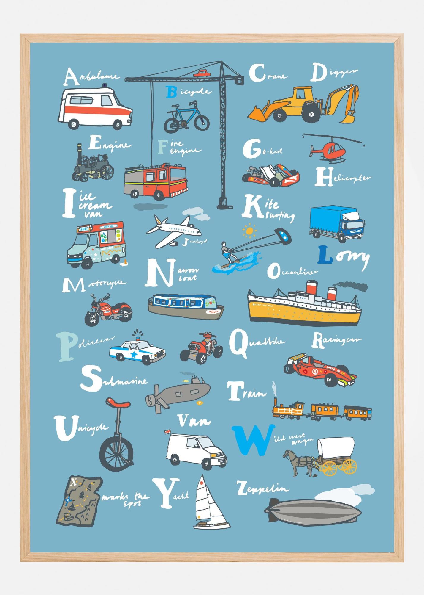 Denna charmiga och lekfulla poster är en alfabetisk resa som kombinerar fordon och bokstäver på ett kreativt sätt, perfekt för att inspirera och lära barn om alfabetet och olika transportmedel. Från A för ambulans till Z för zeppelinare, är varje bokstav representerad av en detaljrik illustration som fångar fantasin. De klara och livfulla nyanserna av blått, rött, gult och andra accentfärger gör detta till ett iögonfallande print som livar upp vilket barnrum eller spelrum som helst.