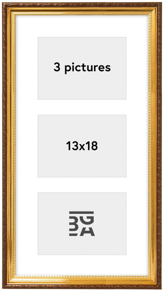 Med denna collageram kan du pryda din vägg med bilder på familj, vänner och fotominnen från härliga stunder i livet. Ramen har plats för 3 bilder i storlek 13x18 cm. Den guldfärgade ramen har vacker retrostil med en dekorativ ytterlist i varm brun nyans. Väggfäste finns.