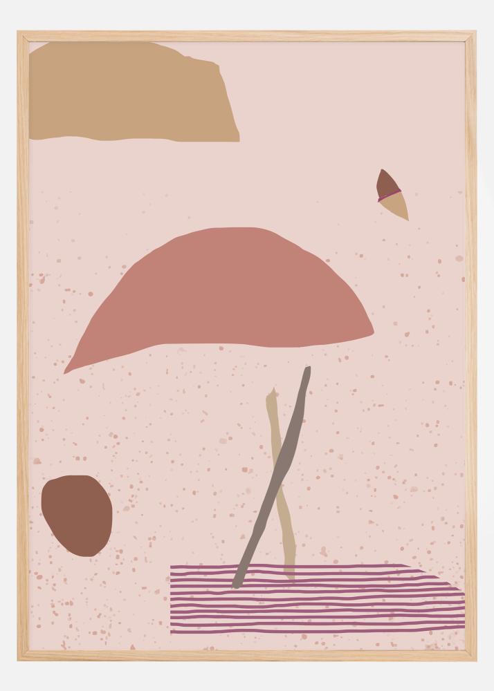 En abstrakt poster med röda, beiga, rosa och lila former på en mjuk spräcklig bakgrund. Njut av den lugnande effekten i formerna och fundera på vad det betyder när du ser en boll, molnform, pinnar, matta eller paraply i verket. De mjuka tonerna är perfekta för exempelvis en badrumsvägg.