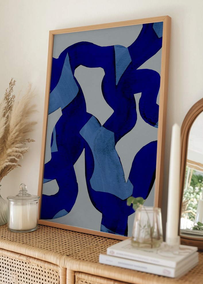 Denna abstrakta affisch fångar ögat med sina djärva och slingrande former i en dynamisk blå palett. De mörkblå och ljusblå tonerna skapar en fascinerande kontrast mot bakgrunden, vilket ger liv och rörelse till posterns övergripande design. De slingrande linjerna ger en känsla av rörelse och flöde, perfekt för att tillföra en modern touch till vilket rum som helst.