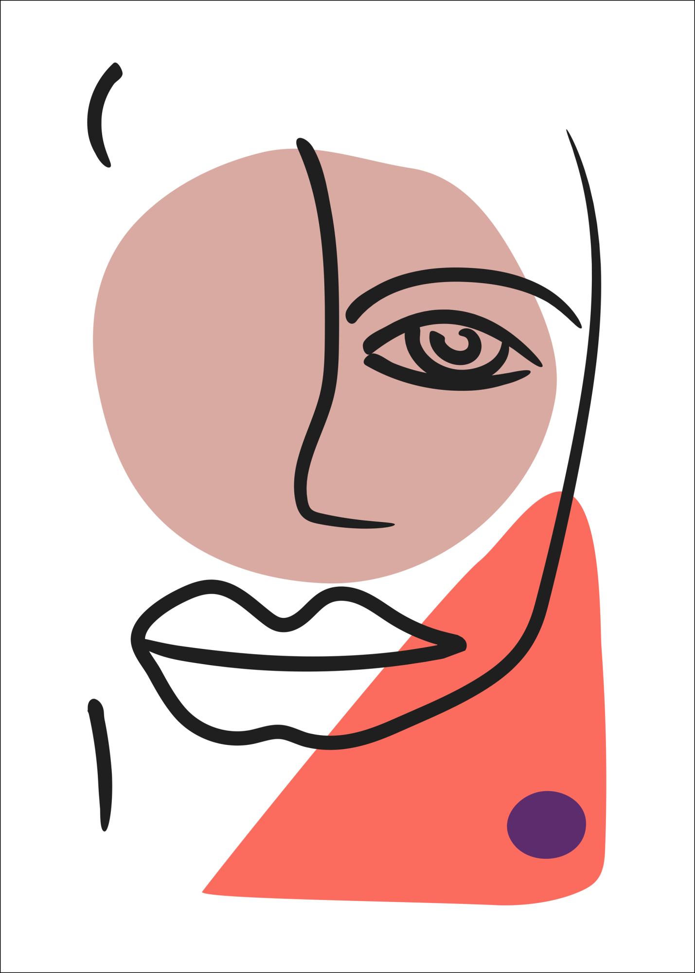 En abstrakt poster av ett ansikte komplett med öga, näsa och fylliga läppar. De svarta linjerna i ansiktet är placerade på en rosa cirkel och en persikofärgad triangel vilket ger en dramatisk effekt. Fånga känslan och bli inspirerad varje dag med hjälp den här unika postern som väcker fantasin till liv.