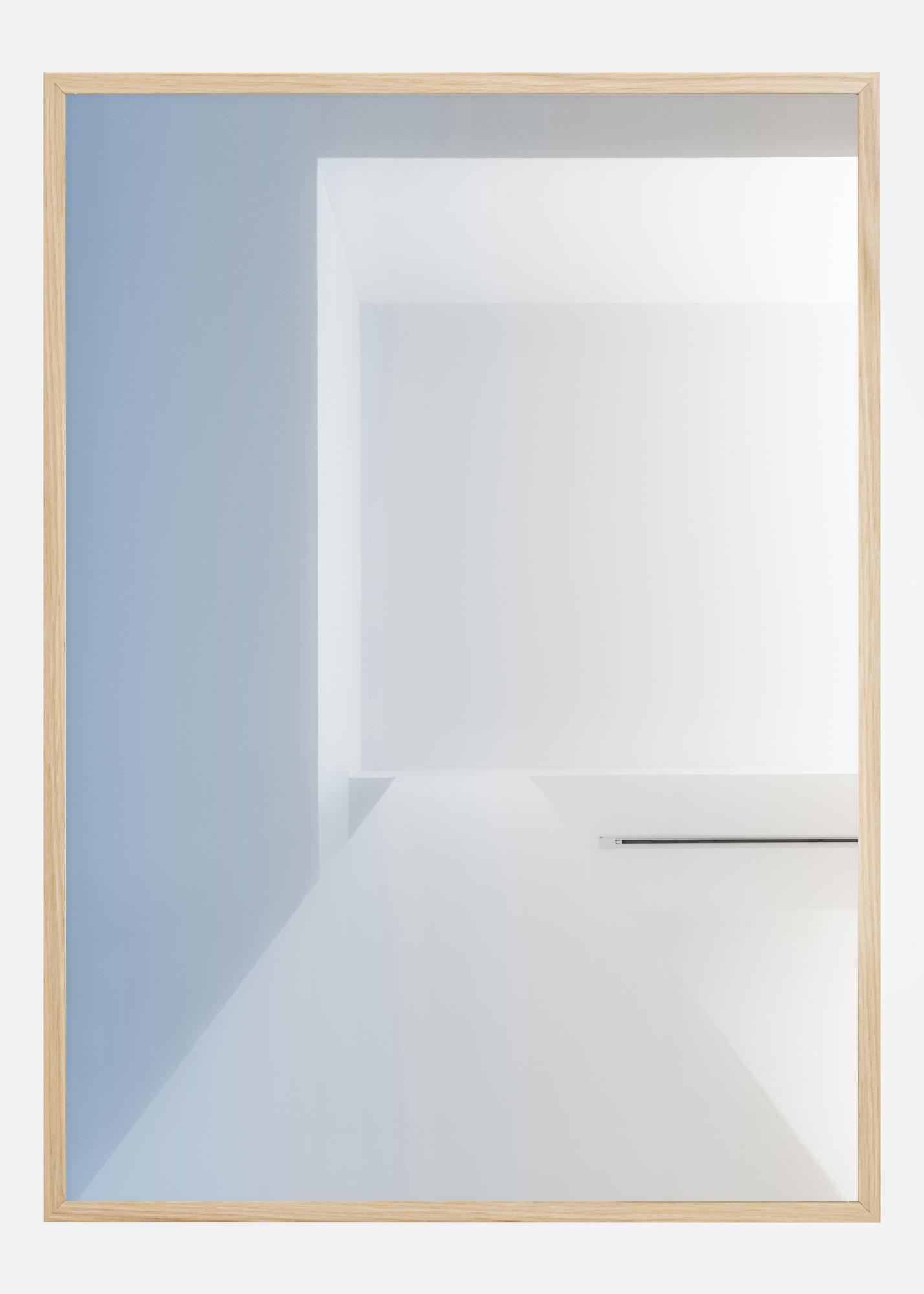 En abstrakt poster för inredning med lugnande blått och vitt. Huvudbakgrunden är mjukt blå med en vit kvadrat som ser ut som ett fönster och en bänkskiva. Ett utbrott av mjukt bländande vitt till höger känns som om solen bryter igenom för ett stänk av lugn i ditt hem.