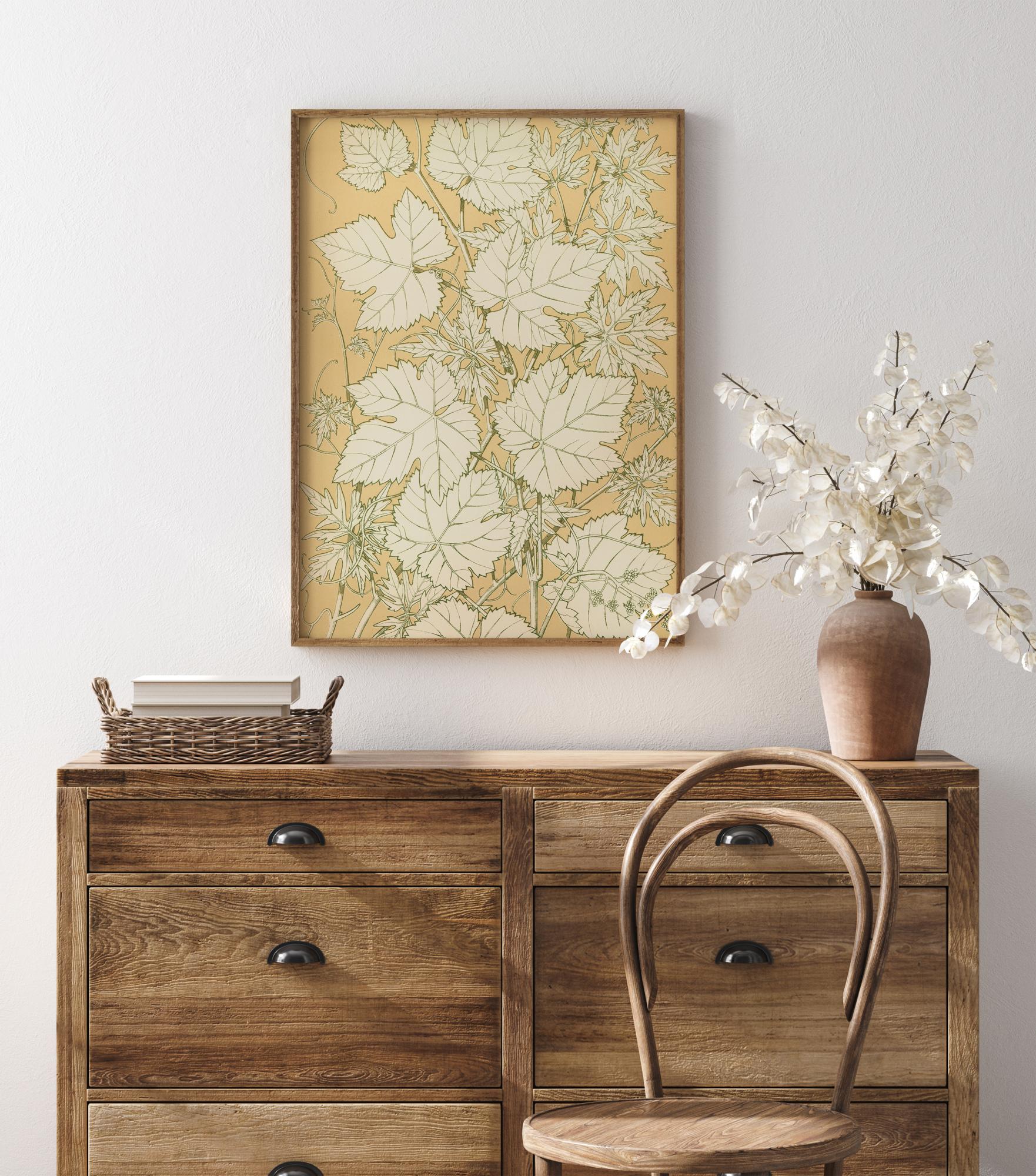 En naturposter med löv på en pastellorange bakgrund. Bladen är ritad med svart bläck och utan färg vilket gör att de sticker ut som ett tryckmönster mot den enfärgade bakgrunden. Liva upp en slät vägg hemma med denna enkla konst i tryckstil när du tar in en bit av naturen i hemmet.
