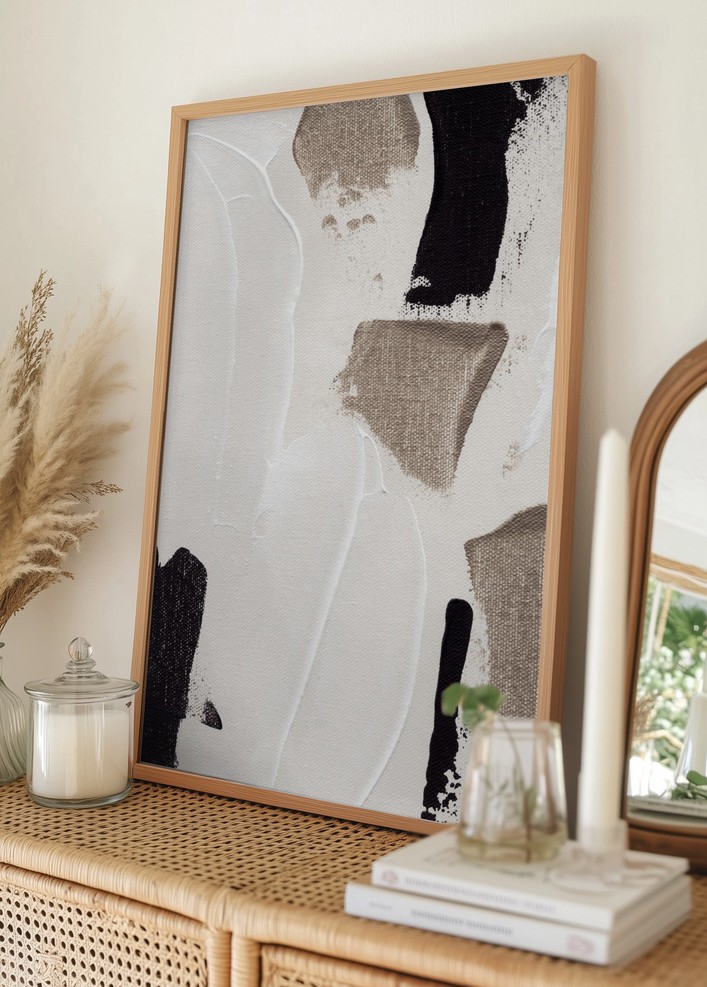 Upptäck en stilren och modern poster som kombinerar abstrakt konst med en tidlös färgpalett. Denna affisch fångar ögat med sina mjuka, svepande former och texturer som väcker intresse. Designen innehåller en harmonisk blandning av svart, vitt och beige, vilket gör den till det perfekta tillskottet i ett trendigt hem eller kontor.