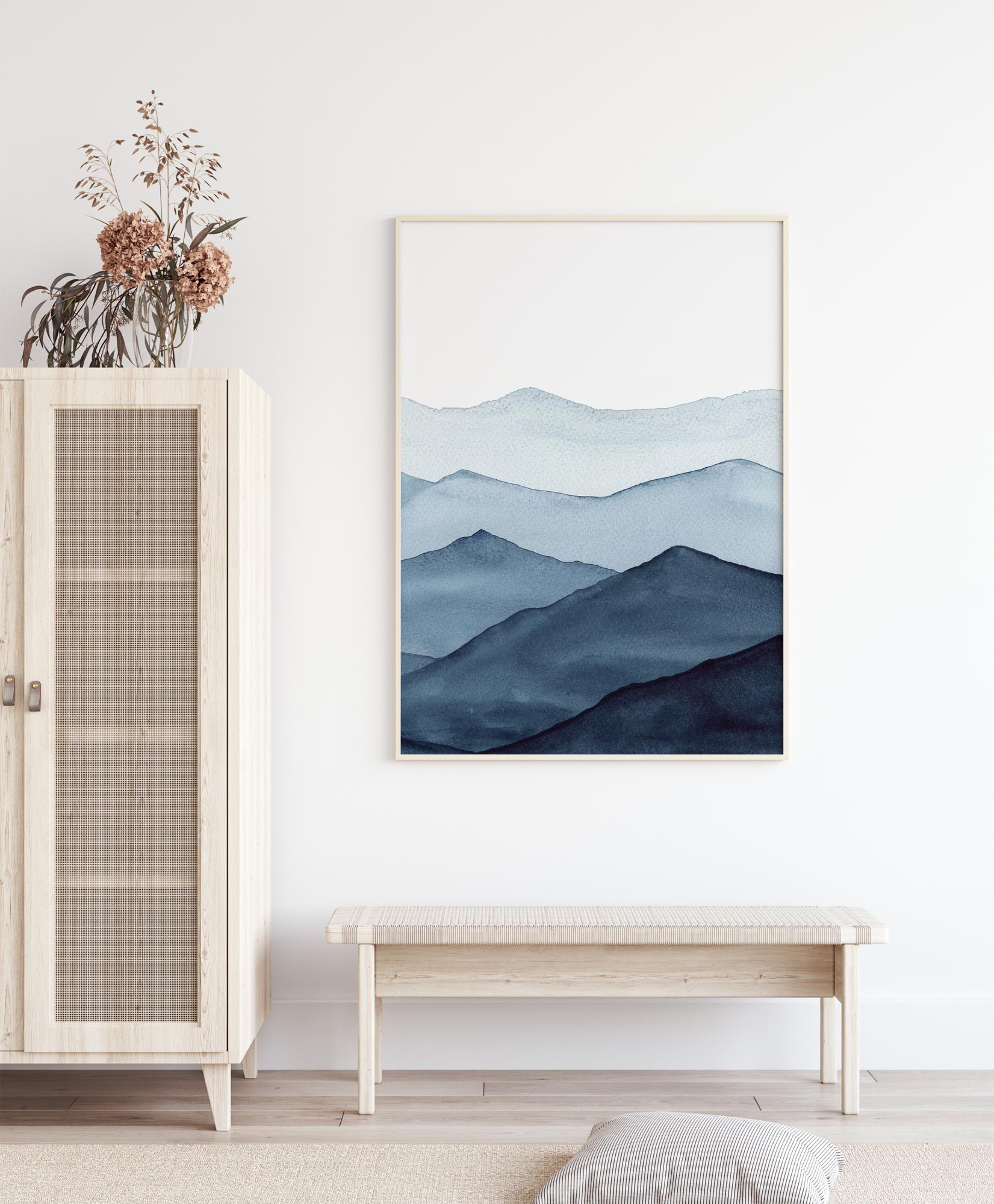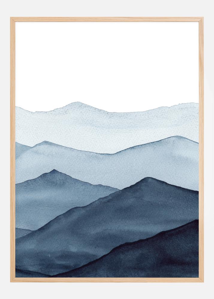 En fantastisk minimalistisk poster av en rad blå berg. Det närmaste berget är en mörk nyans av blått där färgerna blir mer urlakade när bergen försvinner i fjärran. De mjuka blåa färgerna är perfekta för att skapa en sval, men lugnande stämning när du stirrar ut i fjärran.
