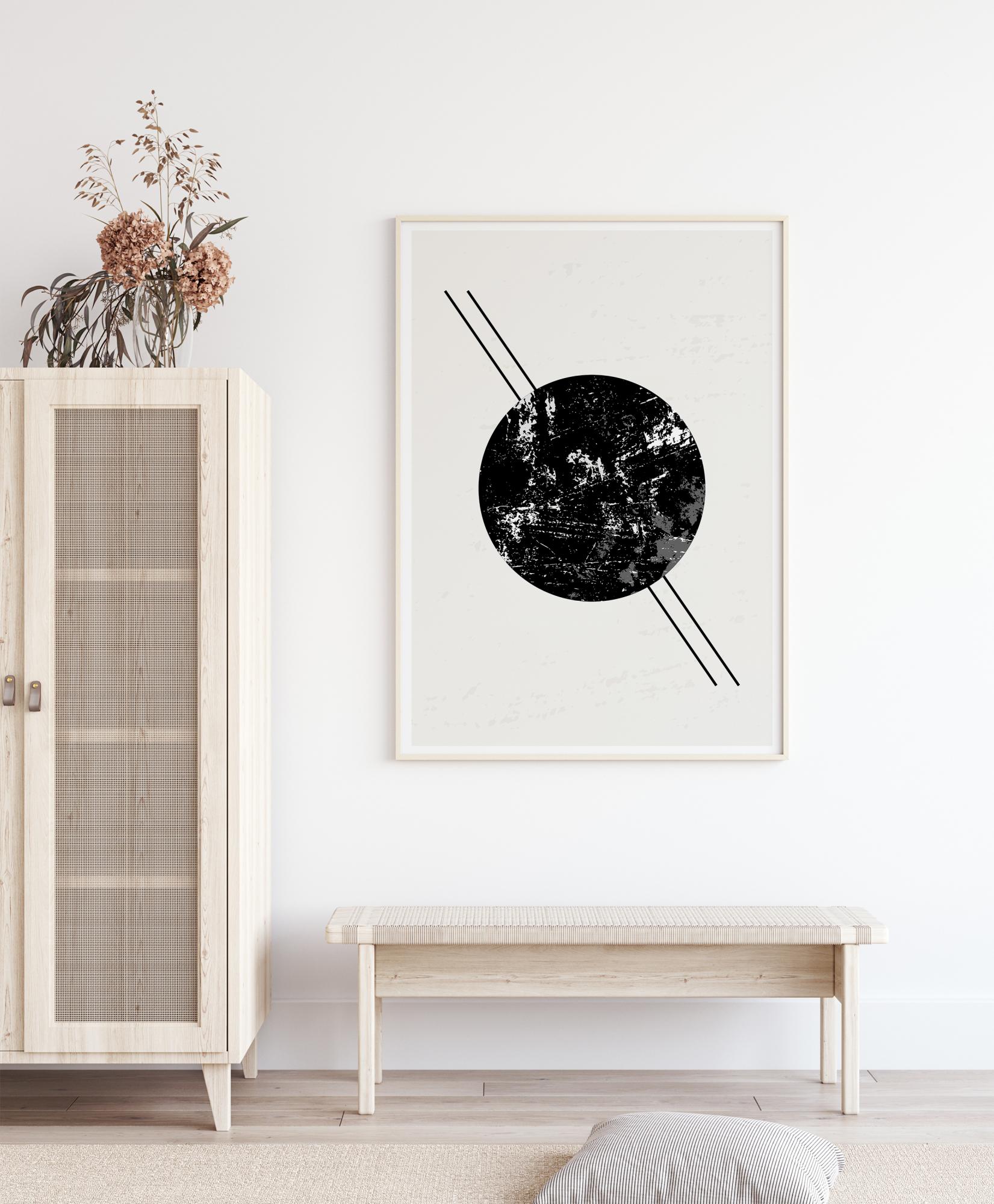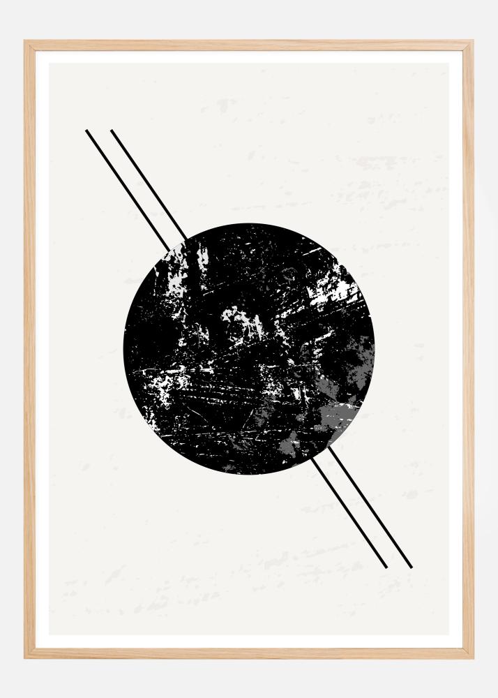 En stark abstrakt poster med en svart cirkel med två linjer som löper från övre vänster till nedre höger hörn. Den svarta cirkeln har en vit och grå marmoreffekt där de två svarta linjerna nästan bildar Saturnus ringar. Ta hem den här och se alla möjligheter i detta tankeväckande konstverk.