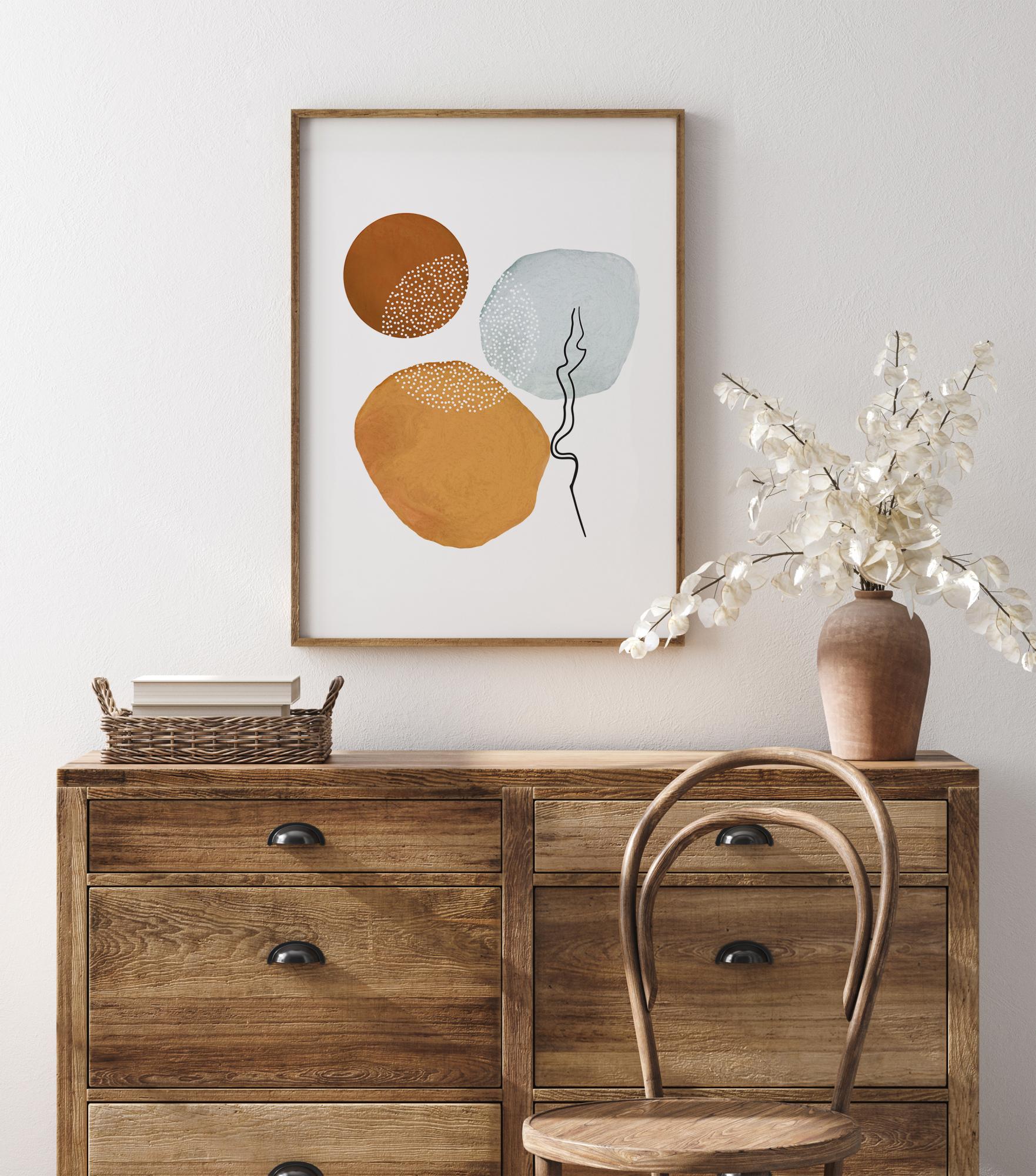 En enkel abstrakt poster med tre huvudsakliga cirkulära former. Över dessa tre former överlappar en cirkel som består av små vita prickar likt en maskrossklocka. Två enkla linjer slingrar sig över den blå formen och för samman verket till en helhet. Det här trycket är ett utmärkt komplement till en sofistikerad gallerivägg.