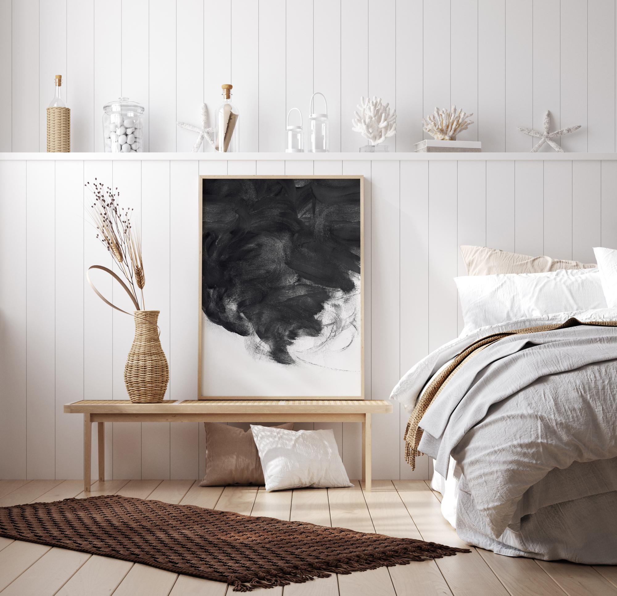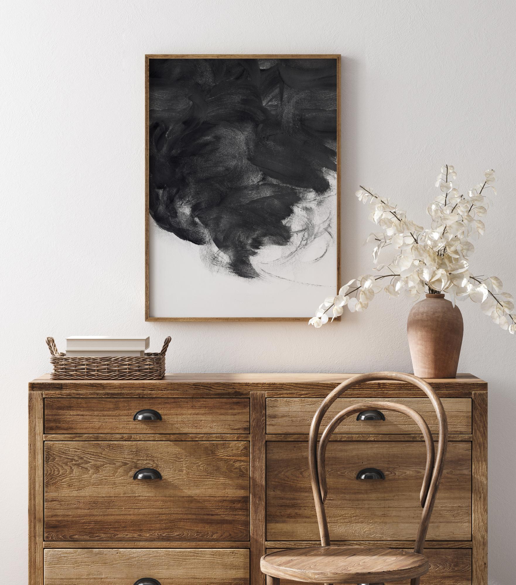 En abstrakt poster av en svart spiral. Detta fantastiska svartvita verk leder blicken från toppen till mitten via den svarta spiralen. Där svart möter vitt kan du föreställa dig en grotta, ett oväder, en storm eller ett moln i den här postern som är full av dynamik. Placera den här på en ljus vägg för en dramatisk och episk känsla.