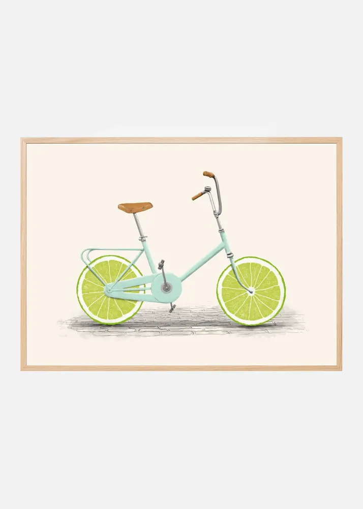 Färgpaletten i denna affisch är både mild och uppfriskande, med cykelns ram i en mjuk pastellblå ton som kompletteras av det livfulla gröna från limefrukterna. Detaljarbetet i illustrationen, inklusive skuggningen och konturerna av cykeln, framträder snyggt mot den simpla och stiliga bakgrunden. Denna konsttryck innehåller nyanser av blått, grönt, beige och grått, vilket gör den mångsidig nog att passa in i många olika inredningsstilar.