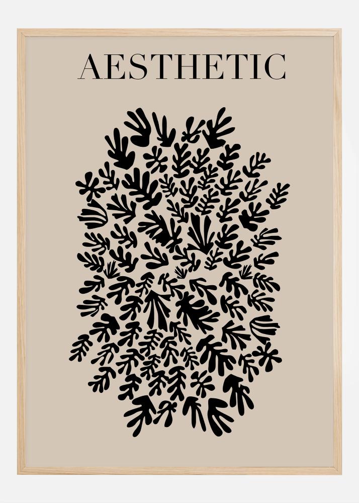 Med dess moderna uttryck och enkel färgpalett, som begränsas till svart och beige, ger denna print ett lugnande och balanserat intryck. Ordet "AESTHETIC" som placeras i övre delen av motivet fungerar som en kraftfull påminnelse om designens och naturens eviga skönhet. Denna affisch skulle göra sig utmärkt i en inredning där man önskar skapa en oas av ro och inspiration, eller som en del av en större tavelvägg för att skapa en samlande visuell upplevelse.