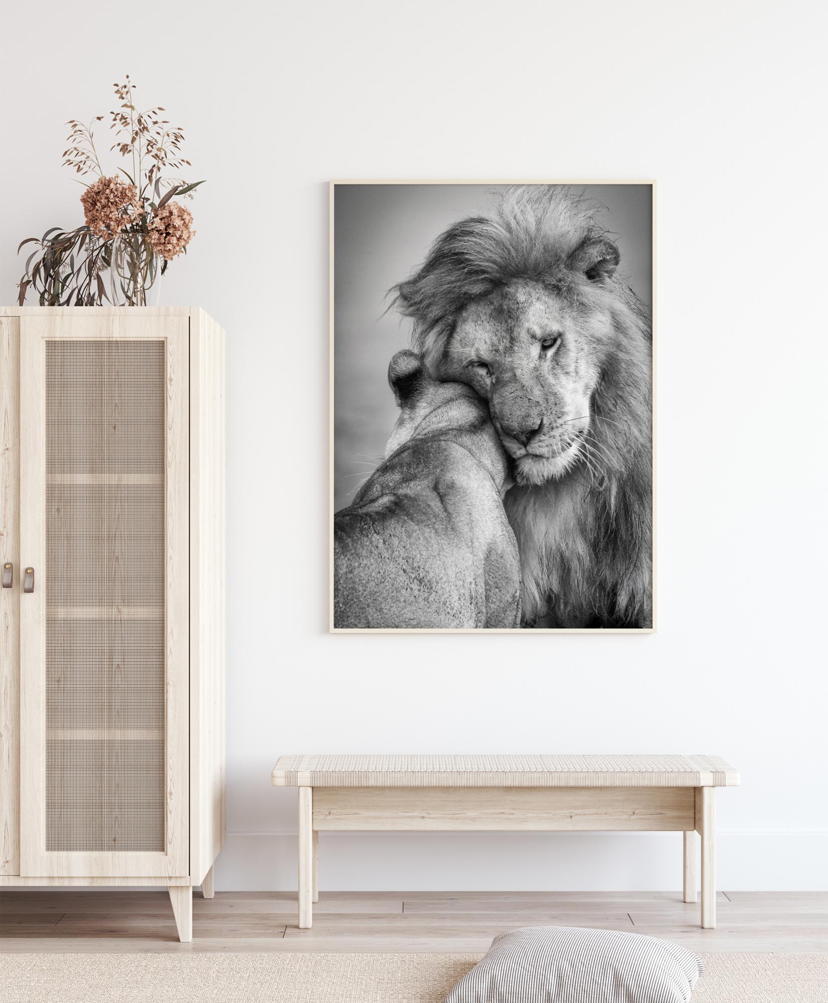 En naturposter med ett lejon och en lejoninna i ett ömt ögonblick. På den här fantastiska svartvita bilden ser du lejonhannen som omfamnar sin lejoninna där hon ligger med ryggen mot honom. Upplev kärleken i den här varma omfamningen när du stiger upp varje morgon.