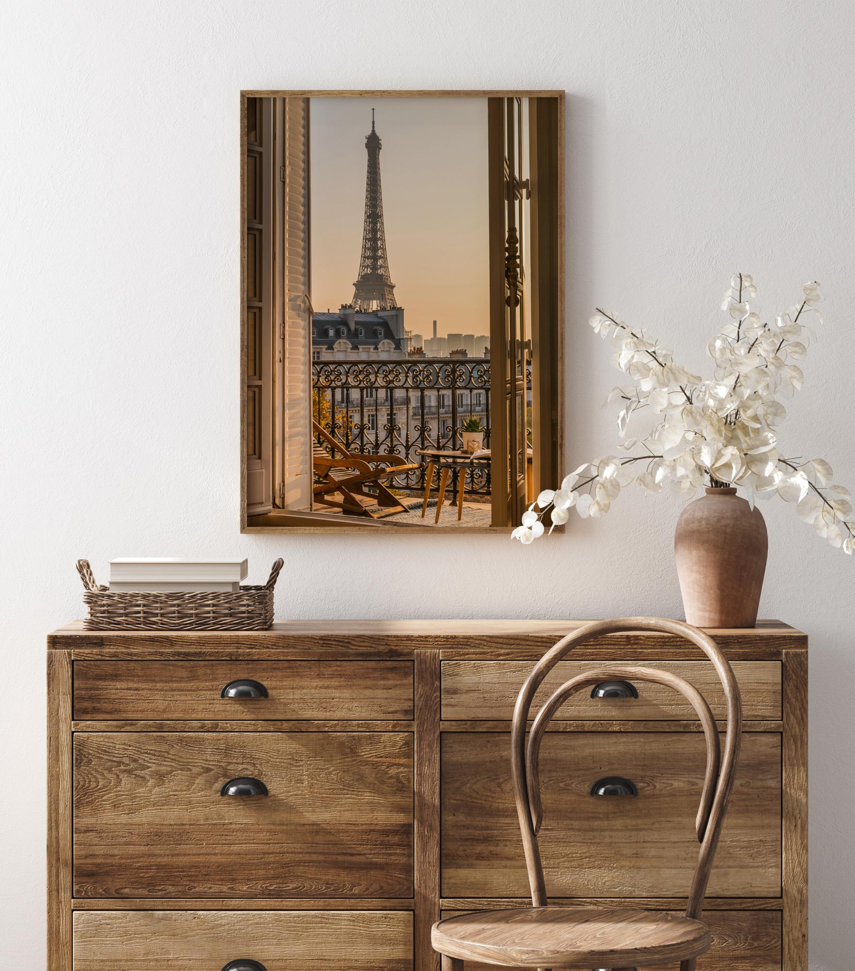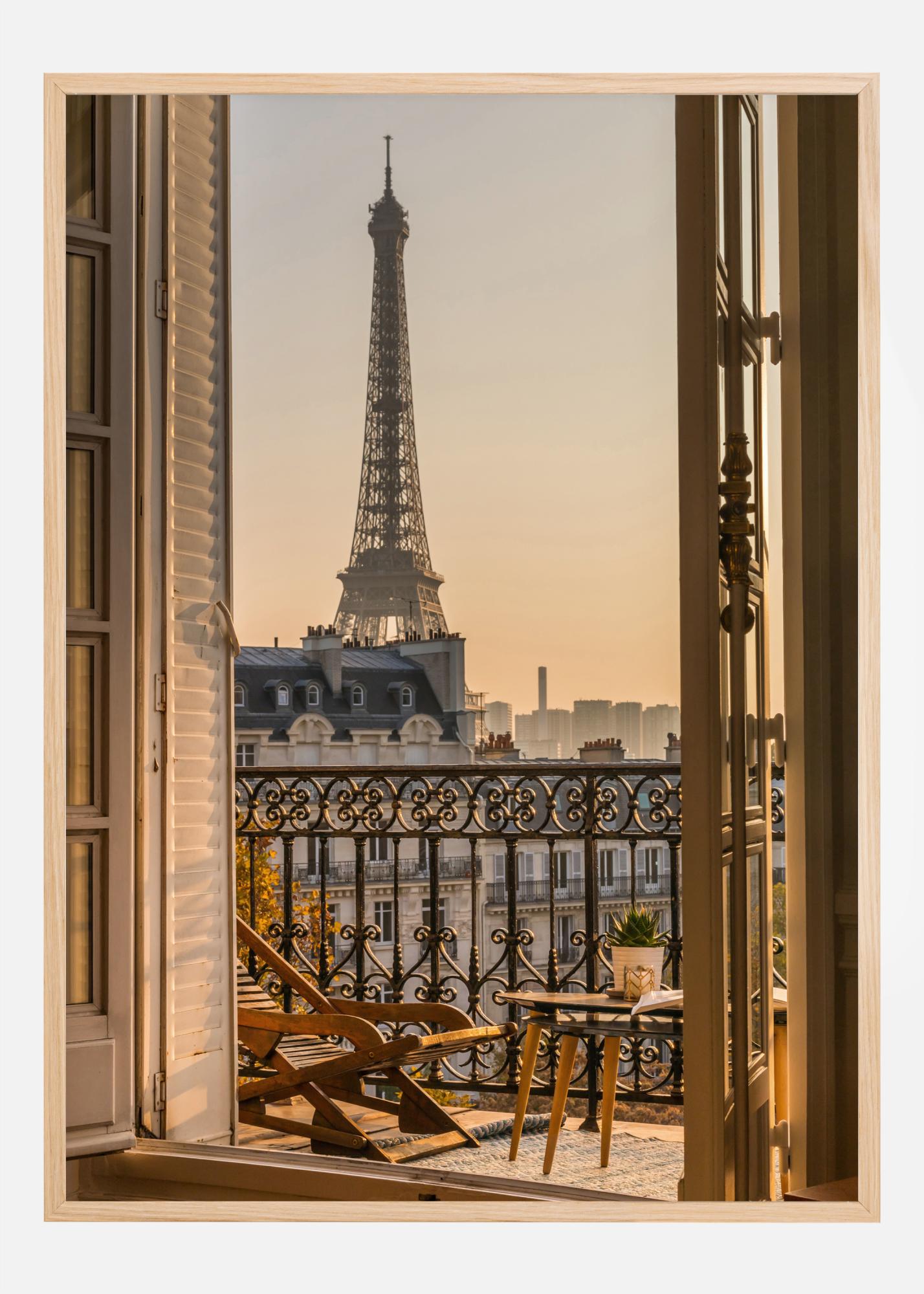 En vacker stadsbildsposter som visar Eiffeltornet i fjärran. En utsmyckad balkong är platsen för den här bilden med ett mjukt morgonljus som täcker stolen och räcket. Tornet står högt och drar blicken till sig. Du kan nästan känna den svala brisen genom de öppna dörrarna.