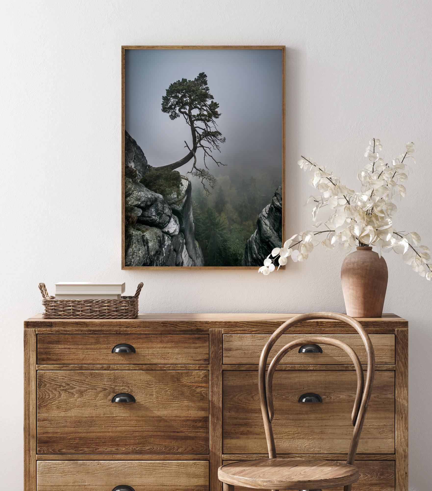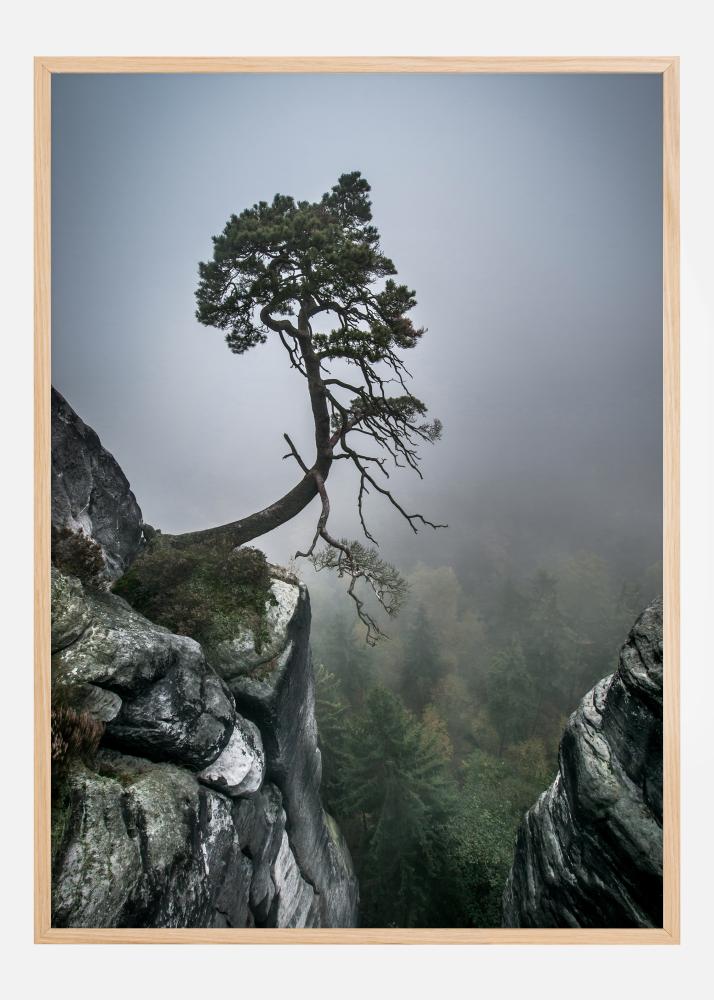 En dramatisk naturposter av ett förvridet träd som växer på sidan av en klippvägg. I full färg lutar sig trädet ut i en avgrund mellan två gråa klippor. En dimhöljd skog skymtar i nederkant och ljuset framhäver det klängande trädet. Ta med dig naturens dramatik hem när du köper det här verket.