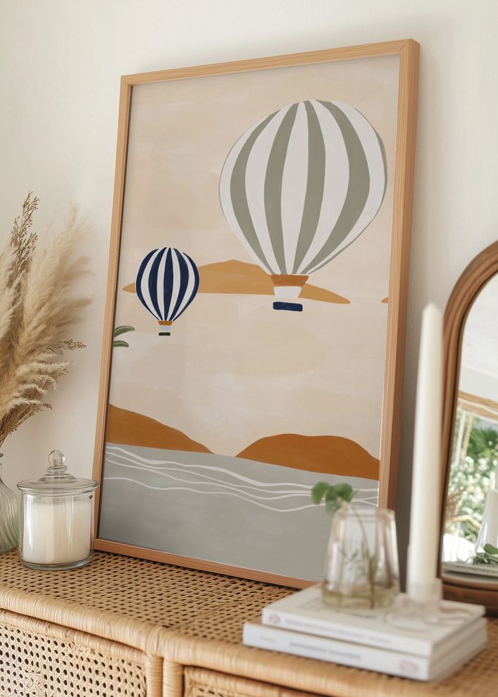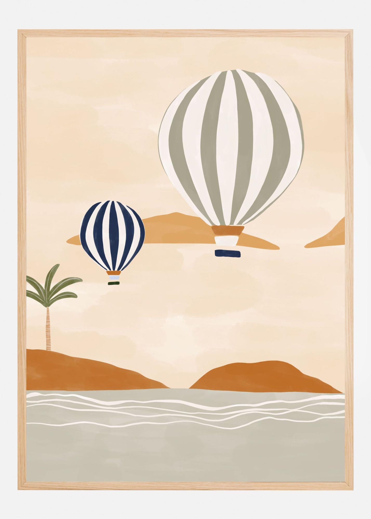 Denna poster fångar en lugn och harmonisk scen med två luftballonger som svävar över en idyllisk landskap. Den större ballongen är i mjuka grå och vita ränder, medan den mindre ballongen har en elegant kombination av marinblå och vit. I bakgrunden sträcker sig en klar himmel och solbelysta berg, vilket skapar en drömlik atmosfär.