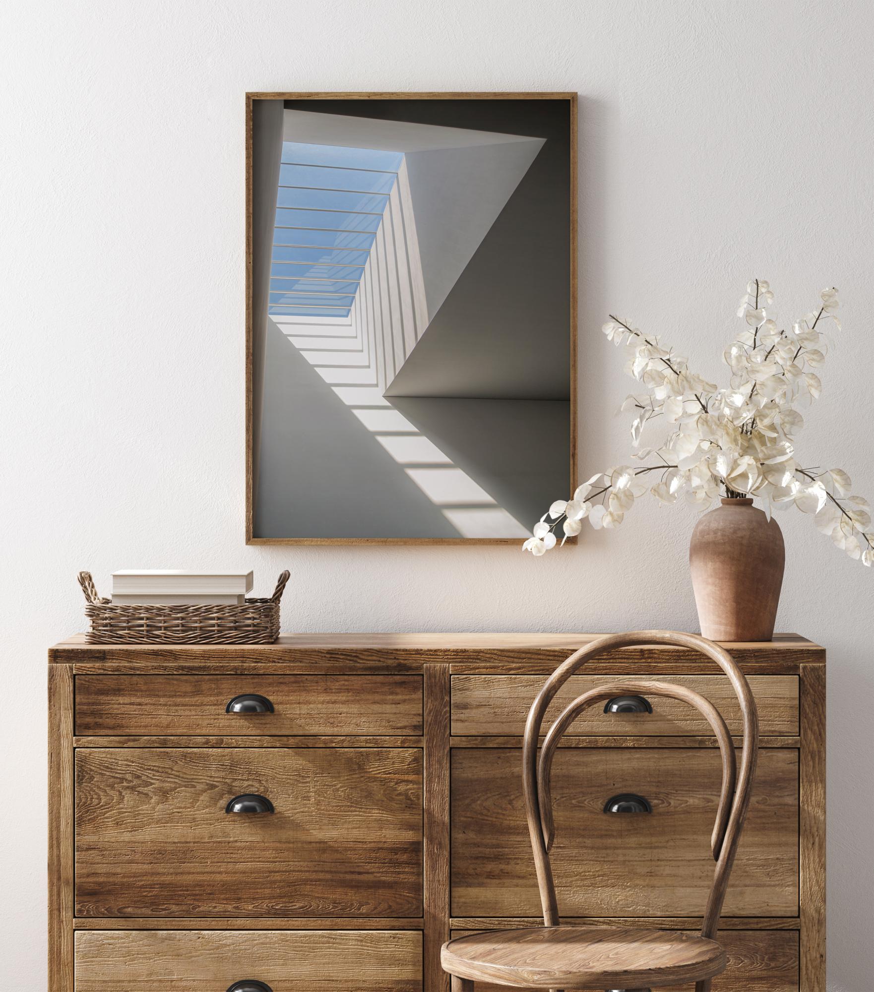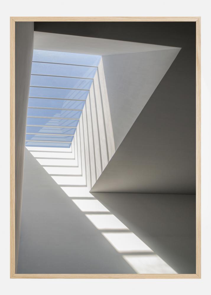 En enkel och luftig poster i ett ljust vitt rum. Till vänster finns en takkupa med en blå himmel. Ljuset som strömmar igenom kastar skuggor som ser ut som en stege som leder ögat upp till ljuset utomhus. Locka fram en ljusstyrka i ett mörkt rum med hjälp av den här fridfulla bilden.