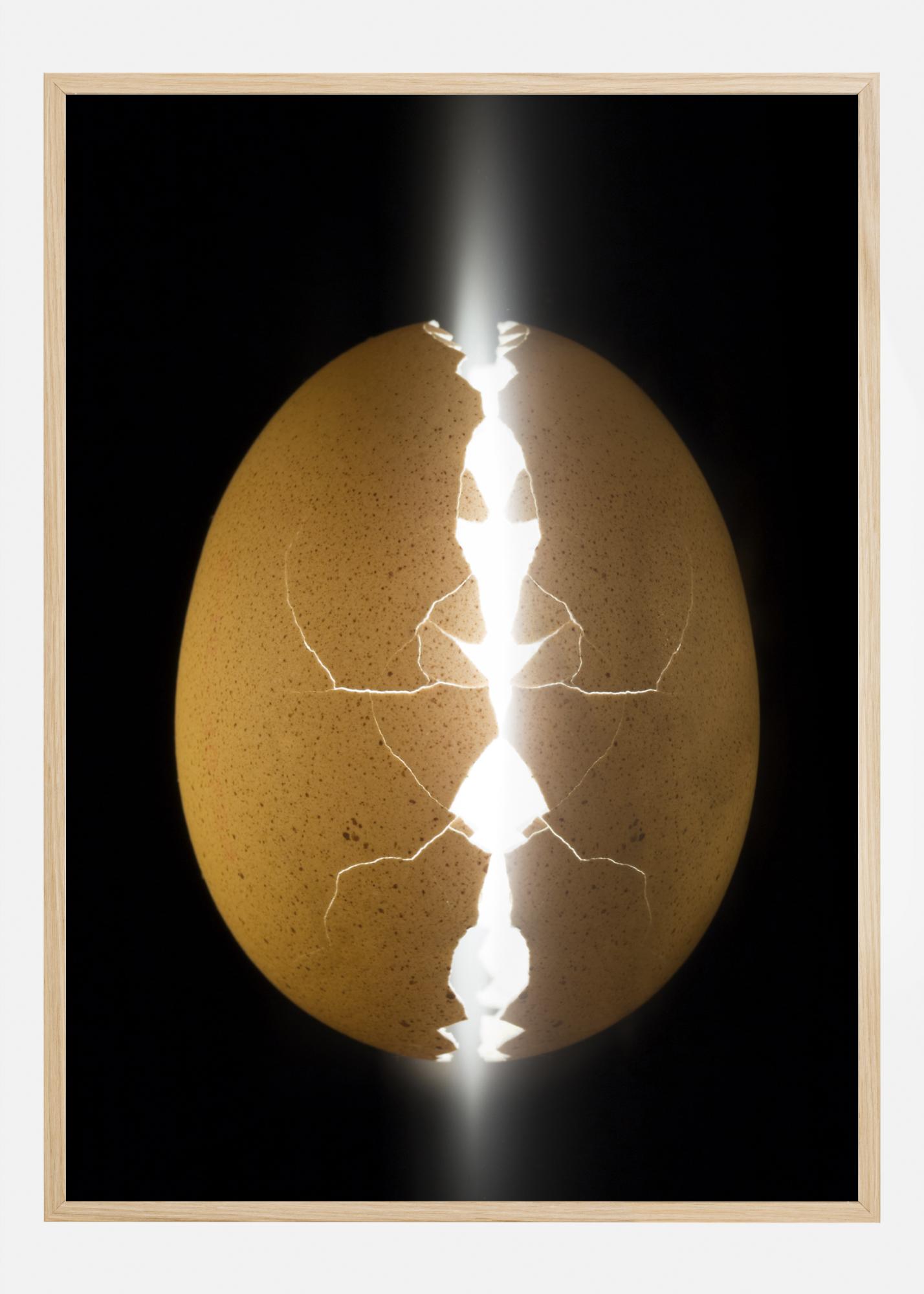 En dramatisk abstrakt poster med ett ägg som kläcks, med starkt ljus som strålar ut från det, allt mot en svart bakgrund. Ljuset spricker genom i ett fantastiskt symmetriskt mönster. Ljusstrålarna övervinner mörkret i en abstrakt, men ändå övertygande bild som är perfekt på vilken som helst av dina väggar.