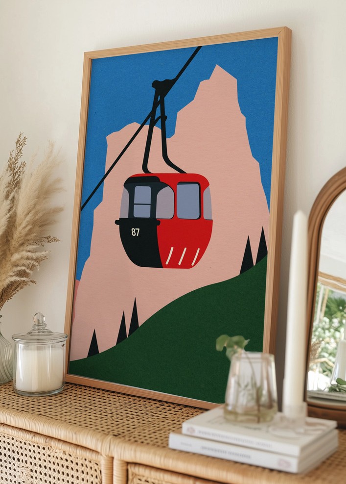 Upptäck en modern och stilren poster som fångar essensen av ett äventyr på hög höjd. Detta motiv visar en färgglad linbana som svävar över en grön kulle, med dramatiska bergstoppar i bakgrunden. Den minimalistiska designen med tydliga färgfält och enkla linjer gör affischen till ett perfekt komplement i ett modernt hem eller kontor. Linbanans röda och svarta färger står i kontrast mot de pastellrosa bergen och den klara blå himlen, vilket skapar en iögonfallande och harmonisk komposition.