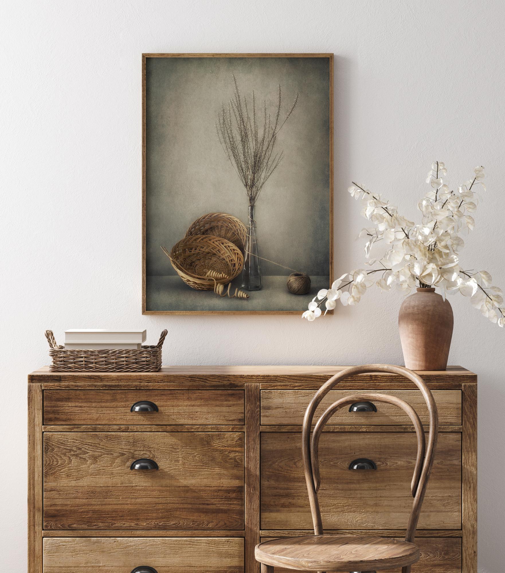 En stillebenposter med korgar, en lerkruka samt en glasflaska med torkat gräs. Det här verket har subtila sepia- och gråtoner som bildar ett mjukt och harmoniskt verk. Få lite lugn i hemmet med den här postern och kombinera den med en neutral vägg så att den inte tar över för mycket.
