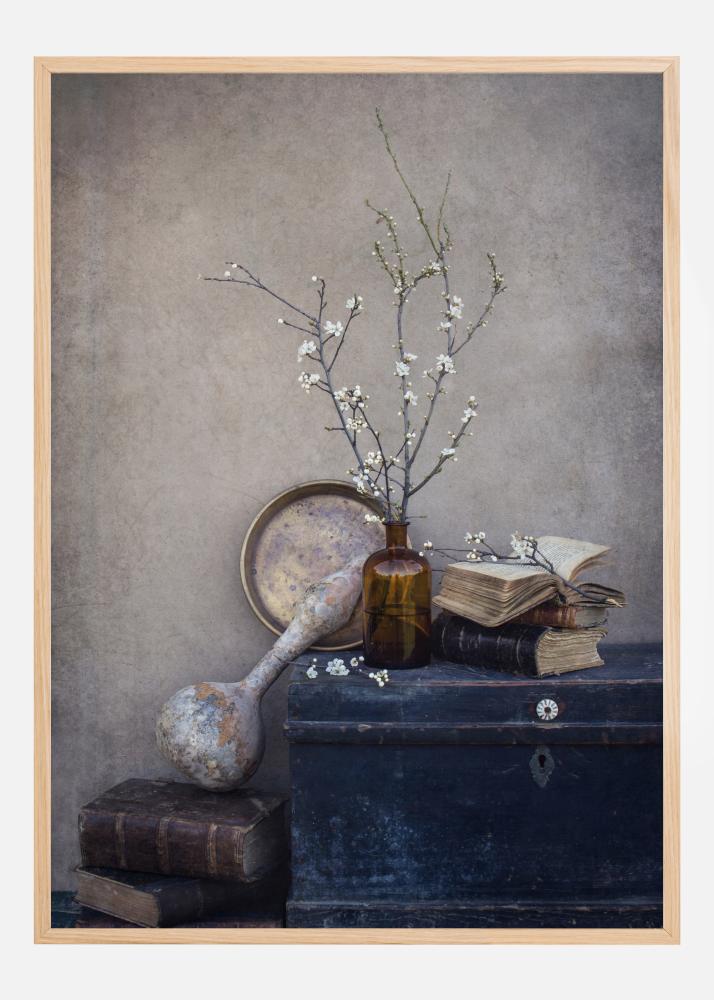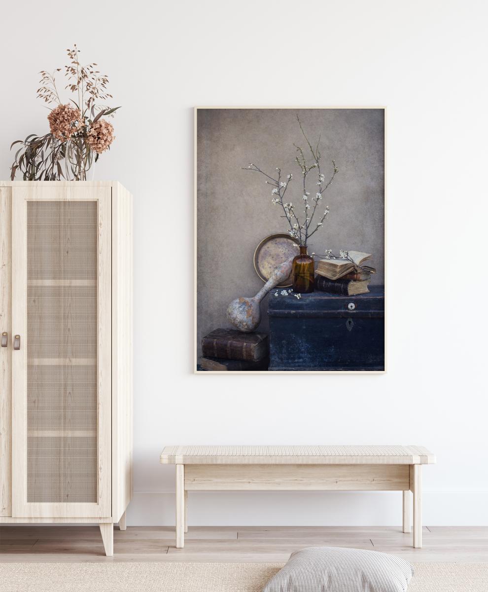 En stillebenposter av en blå kista med en vas, en tallrik, gamla böcker och knoppande blommor. Stillebenet står på en enkel grå bakgrund vilken får den blå kistan att framstå centralt. Om du vill ha en rustik känsla kan du placera den här på en neutral vägg och njuta av de knoppande vårblommorna på de kala kvistarna.