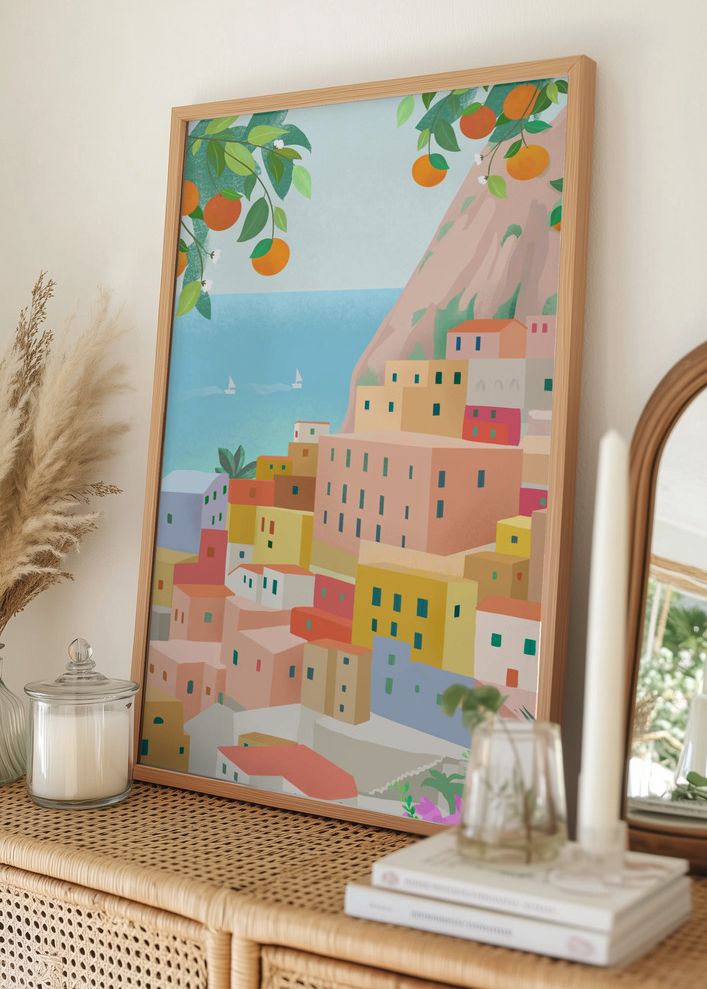 Denna färgsprakande poster föreställer en pittoresk medelhavsby vid havet, där charmiga, färgglada hus klättrar upp längs en klippa. Det turkosa havet i bakgrunden rymmer två segelbåtar som lugnt glider fram, medan den ljusblå himlen möter det öppna havet. Överst i motivet hänger grenar med klarorange frukt, vilket ger affischen en känsla av sommar och exotisk fräschör.