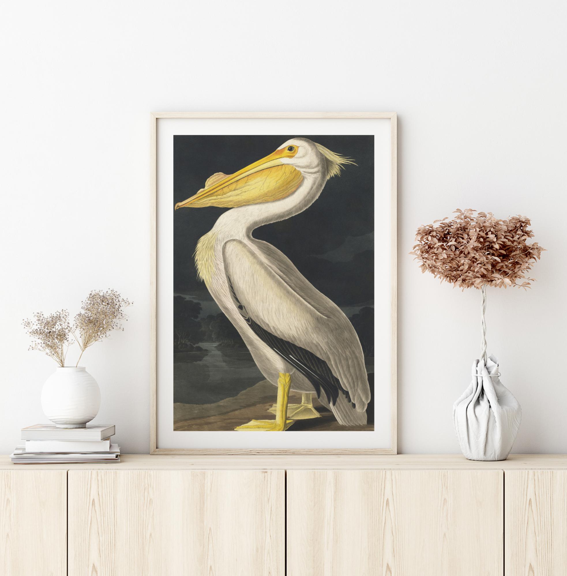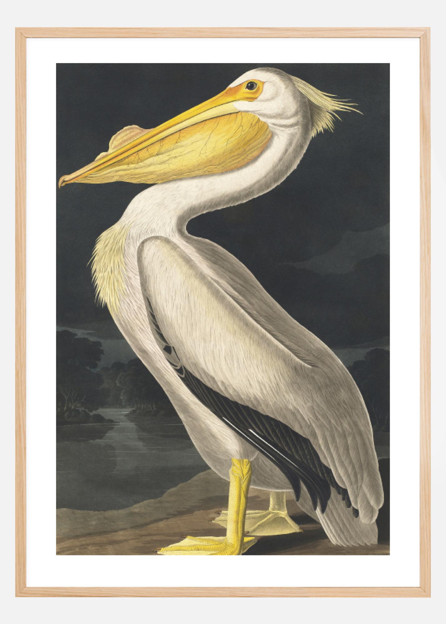 En naturposter av en målad pelikan. Här sitter fågeln högt och stolt med den robusta gula näbben mot bröstet. Markerade gula fötter och det vita bröstet står i skarp kontrast mot det mörka, dämpade landskapet bakom. Ta med dig en känsla av antika målningar när du köper den här fantastiska bilden.