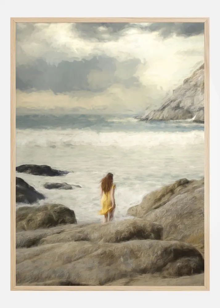 Stilla ditt sinne och låt dig svepas bort till en plats av lugn med vår betagande poster, en hyllning till havets eviga rytm och naturens tysta samtaler. Denna print gestaltar en ung flicka i en gyllene klänning, betraktandes det oroliga havet från klippornas trygghet. Hennes röda hår fladdrar i brisen och smälter harmoniskt in med landskapets mjuka penseldrag, vilket framkallar känslan av en målning snarare än ett foto.
