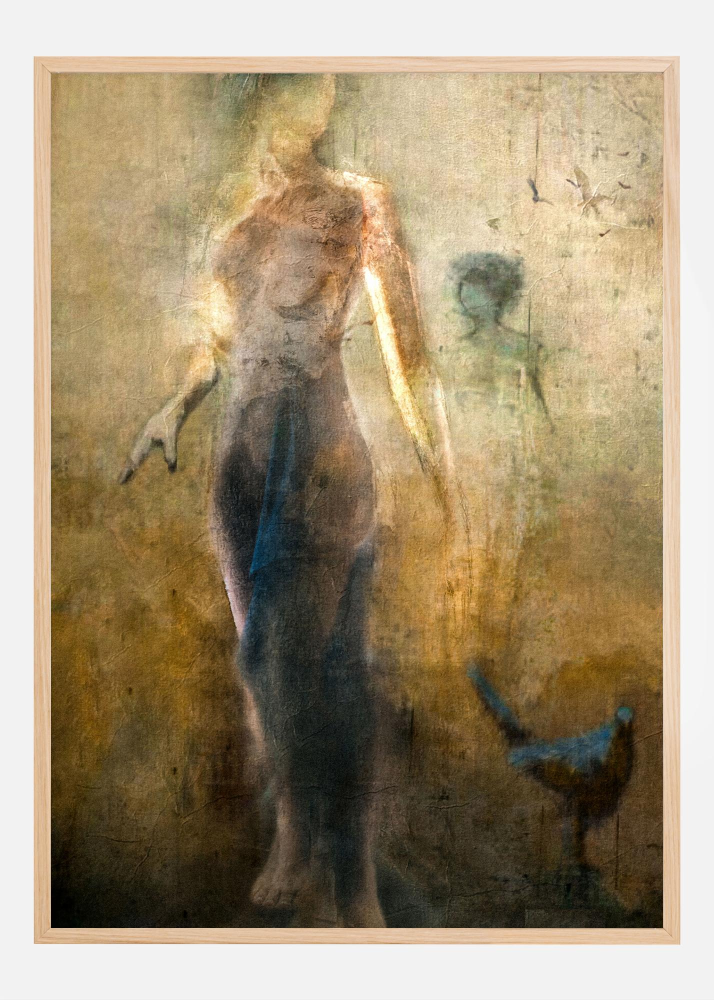 Fånga blicken med denna mystiska och suggestiva poster som verkar berätta en historia utöver det visuella. Motivet utforskar teman av identitet och minne genom en gestalt som framträder ur en grunge-inspirerad bakgrund. Det abstrakta elementet i konstverket uppstår genom det diffusa, nästan spöklika, framträdandet av figuren och de subtila antydningarna av en silhuett i bakgrunden, medan en ensam fågel verkar sväva fritt.