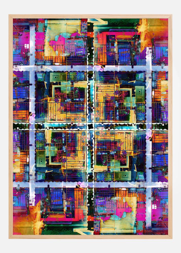 En neonposter full av abstrakta mönster. Som ett spektrum av färger likt en oljefläck liknar den här bilden ett tvärsnitt av olika rum. Varje ruta är fylld med ett myriader av färger som gör det här till ett fascinerande verk du kan titta på i timmar - passar bäst om du sätter den på en neutral vägg.