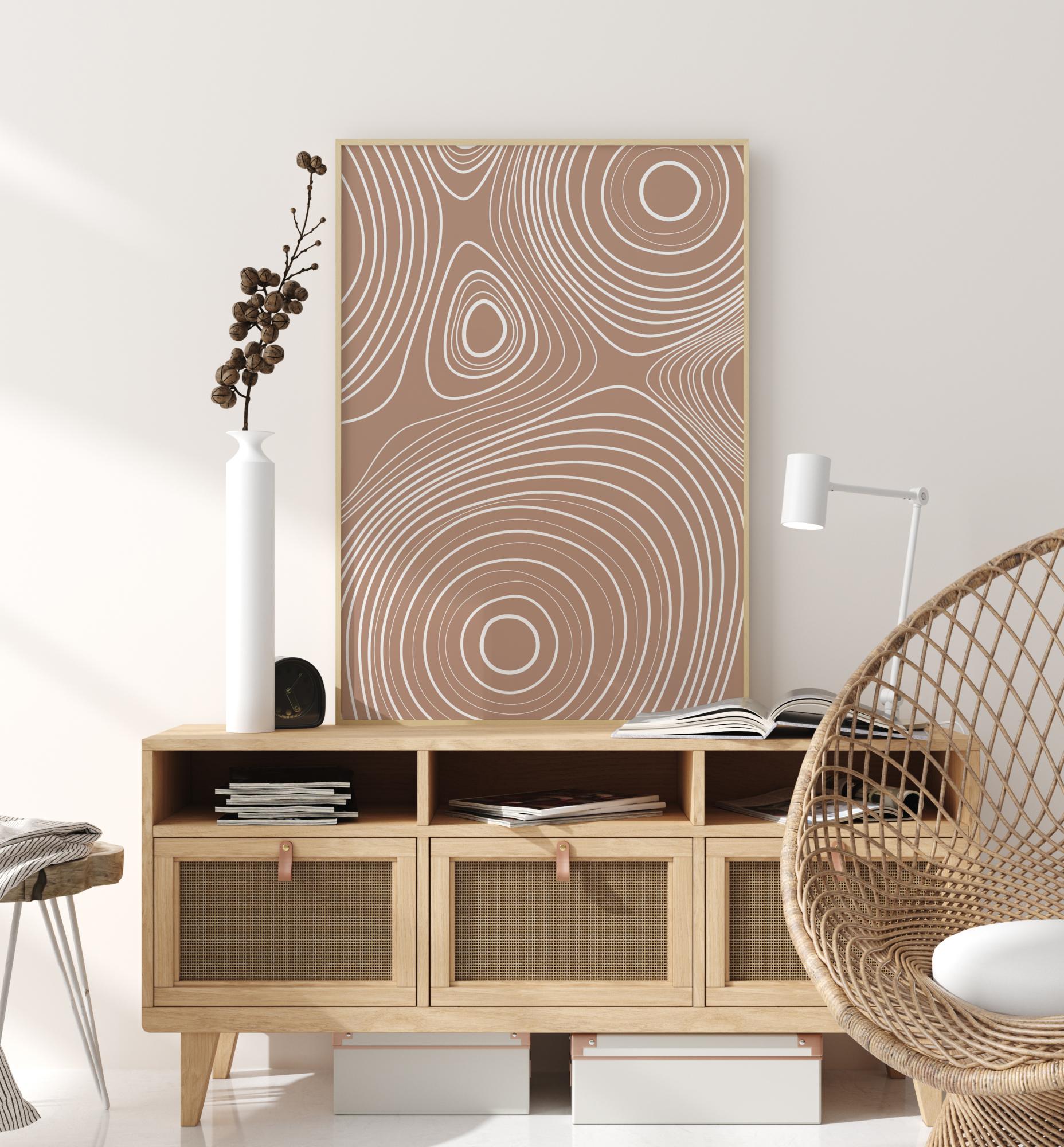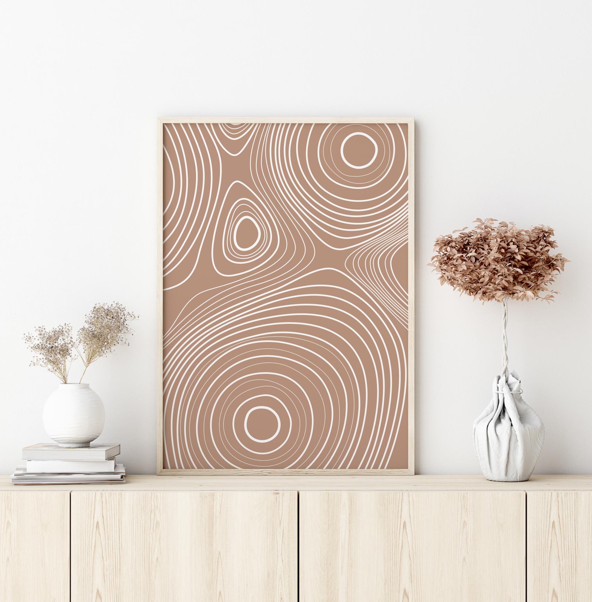 En virvlande abstrakt poster med vita linjer på en ljusbrun bakgrund. Titta på de här vita ringarna när de dras utåt i den här fantastiska bilden. Låt dig gå vilse i dessa lugnande virvlar när hänger upp den här fridfulla postern i ditt hem, den ger perfekt avkoppling i badrummet eller vardagsrummet.