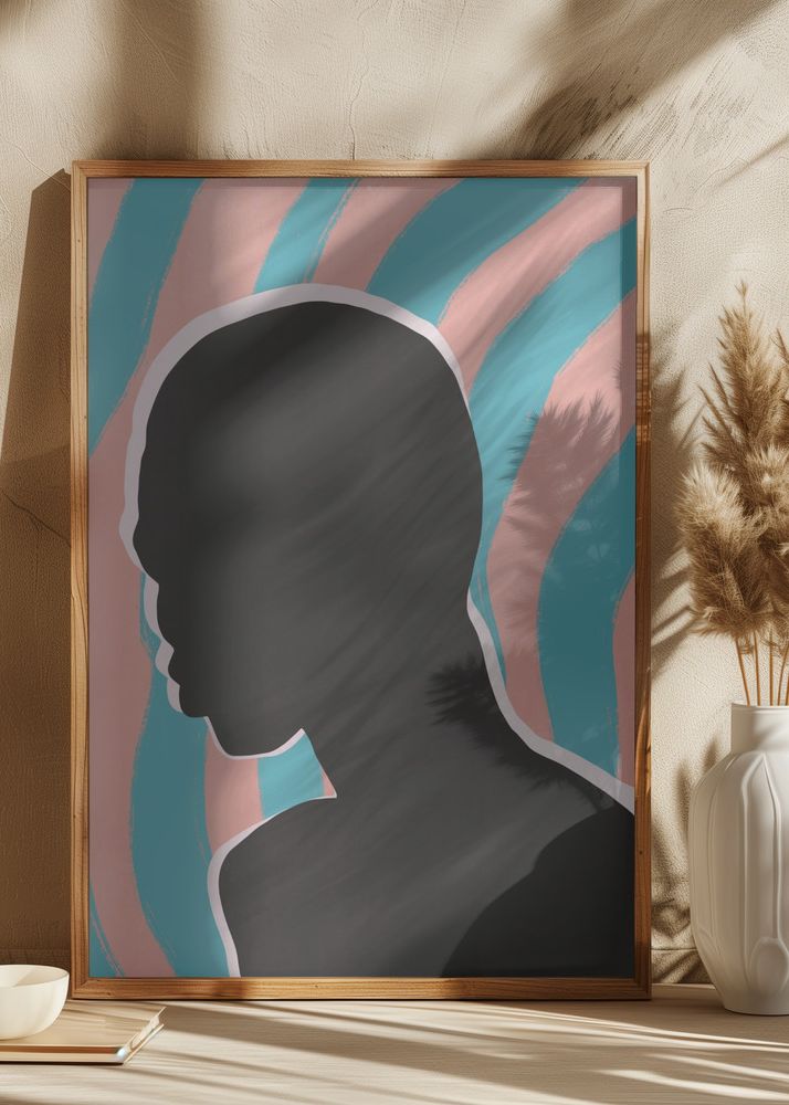 Denna konstfulla poster framkallar en känsla av modern elegans med dess stilrena silhuett av en profil. Motivet utgörs av en svart kontur mot en abstrakt bakgrund, där vågiga linjer i olika nyanser av rosa och turkos skapar en lugnande, men samtidigt dynamisk effekt. Denna print skulle passa perfekt i ett samtida hem eller kontor, tillförandes en touch av minimalistisk design och färg.