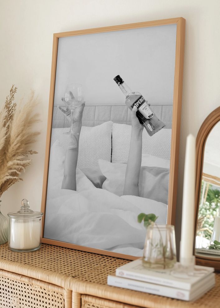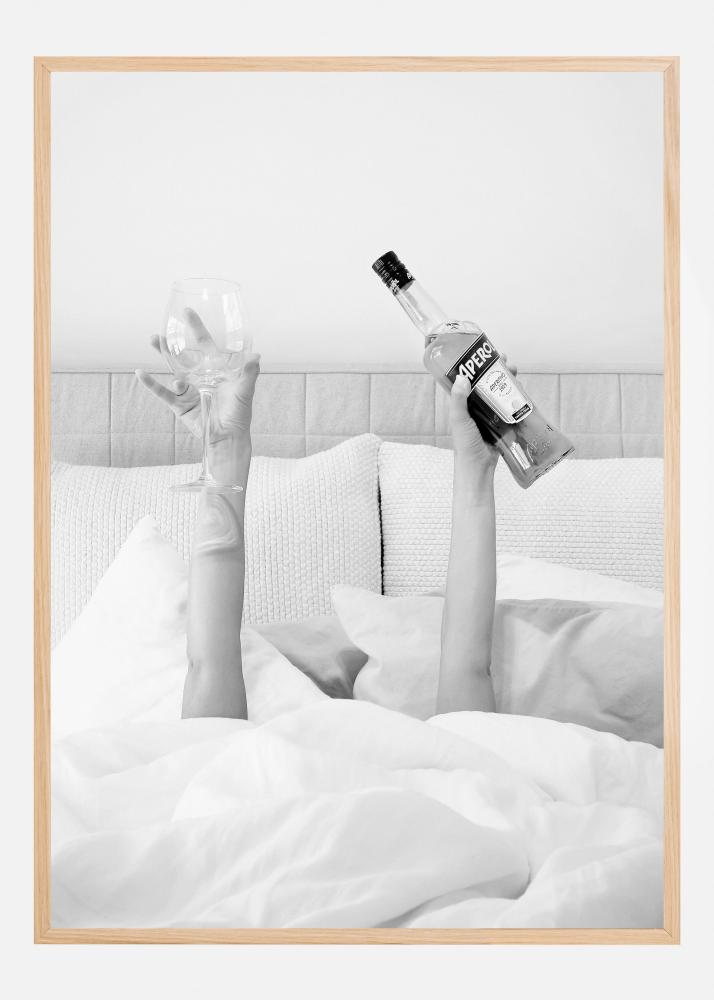 Den här svartvita postern fångar en avslappnad och lättsam atmosfär med en modern touch. Motivet visar armar som sticker upp från vita lakan, där en hand håller ett vinglas och den andra en flaska, vilket väcker känslan av fest och bekymmerslöshet. Perfekt för att ge en stilren och humoristisk känsla till ditt hem eller kontor.