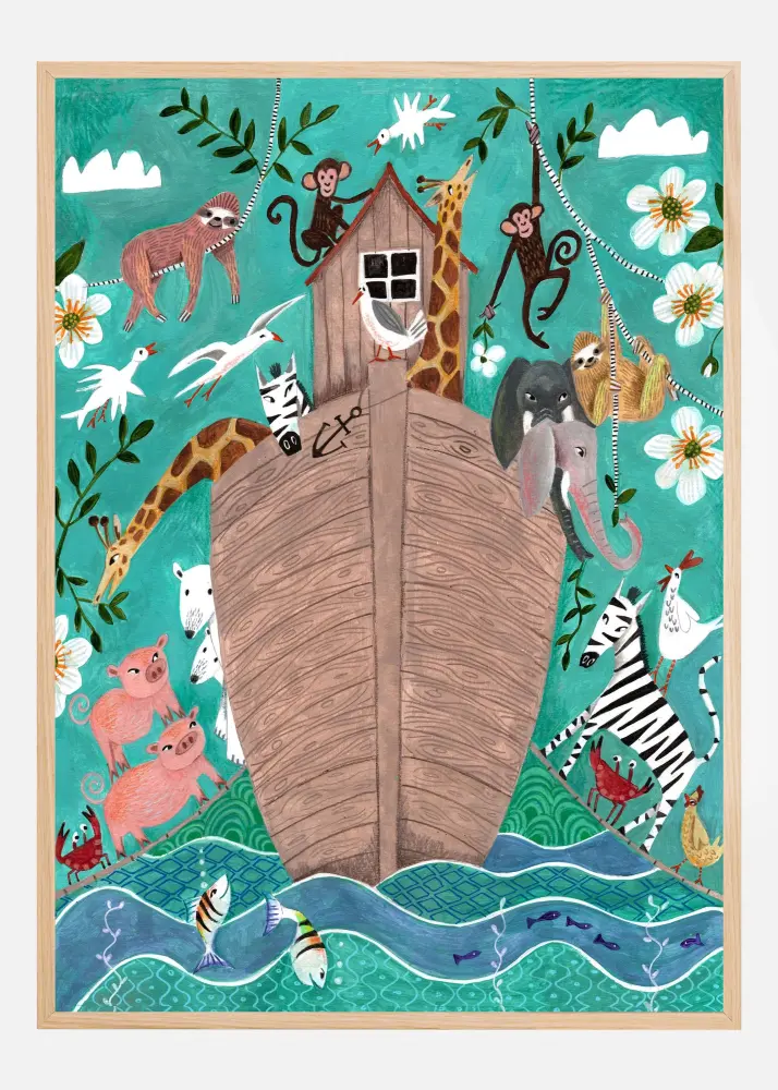 Denna lekfulla och fantasifulla affisch fångar charmen hos en mytisk djurvärld i en sagolikt framställd scen. Motivet illustrerar ett brett spektrum av djur samlat kring ett träfärgat skepp, som ger en känsla av äventyr och kamratskap. Här syns allt från apor och en elefant till en giraff, zebra, tigrar och sjölejon, alla i harmoni. De mjuka, jordnära färgerna i konstverket kombineras med blå- och gröntonerna i vattnet och himlen, vilket skapar en varm och välkomnande atmosfär. Dess detaljrikedom och klara färger gör denna print till ett iögonfallande tillskott i varje rum som söker ett stänk av fantasi och lekfullhet.