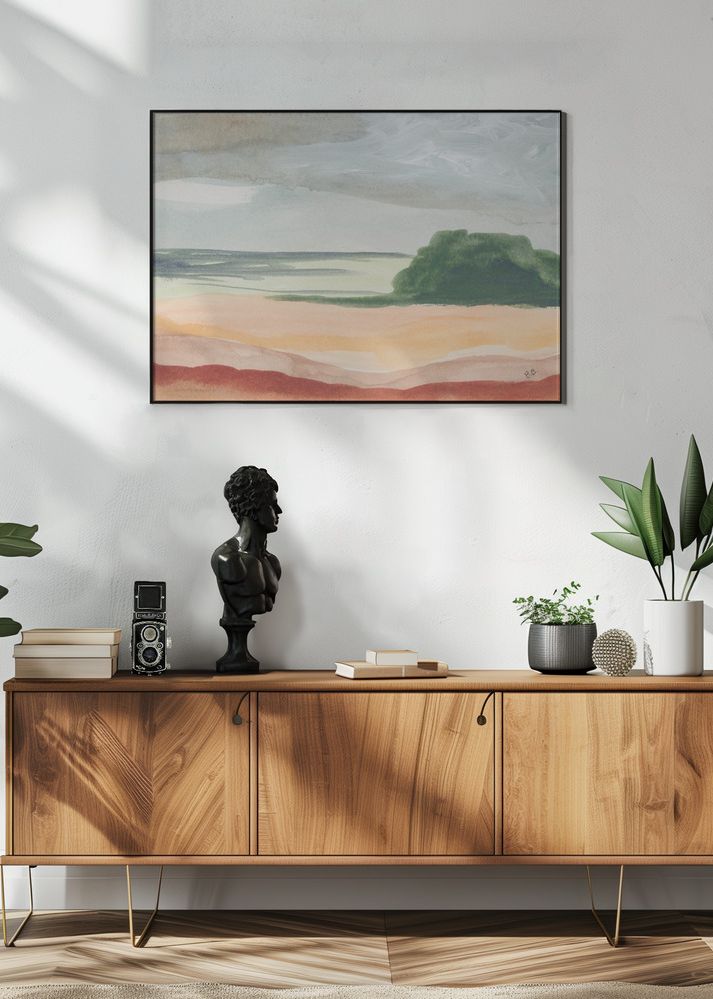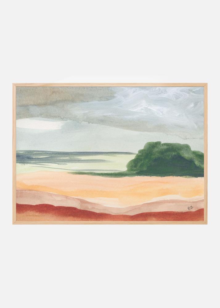 Denna poster fångar en lugn och harmonisk landskapsscen med svepande penseldrag och mjuka övergångar. De dominerande färgerna i detta print inkluderar olika nyanser av grönt, beige och brunt, vilket skapar en naturlig och jordnära estetik. Den subtila blandningen av dessa färgtoner för tankarna till en fridfull eftermiddag i naturen, där träden står stilla och horisonten sträcker sig bortom synfältet.