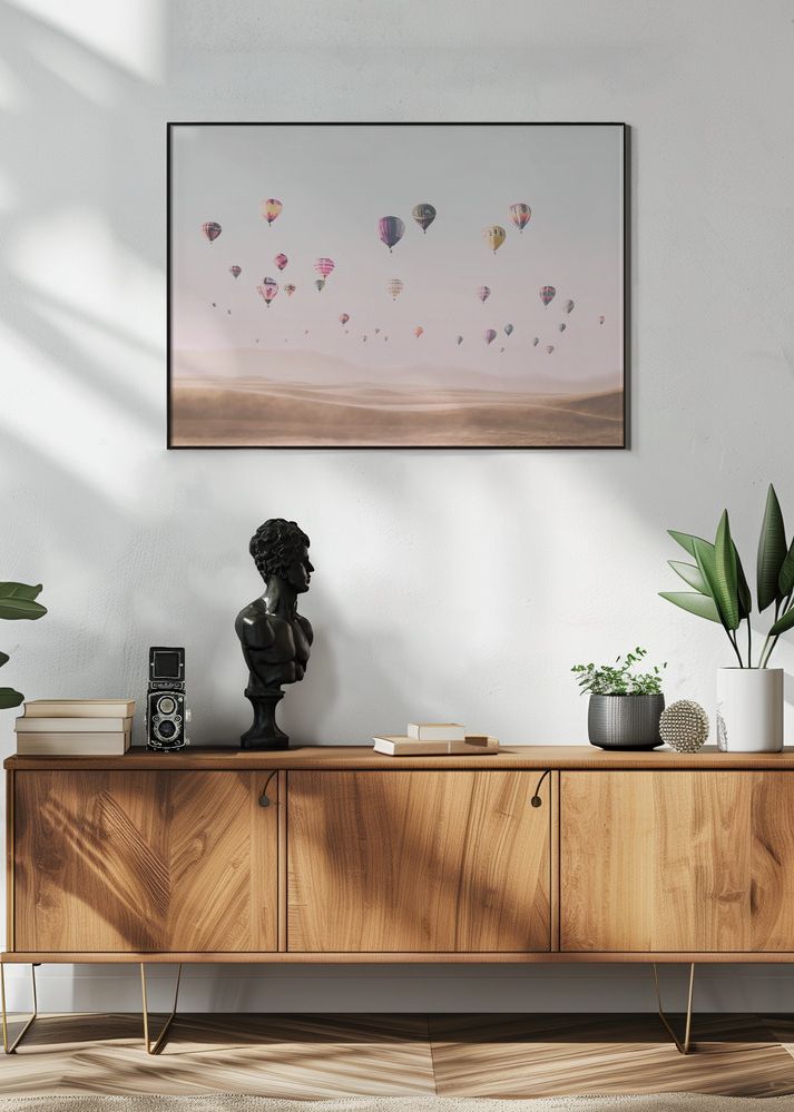 Denna poster fångar en magisk scen av luftballonger som majestätiskt svävar över ett vidsträckt landskap. Det är en print som förmedlar känslan av frihet och äventyr, perfekt för att inspirera och ge rummet en känsla av rörelse och fantasi. De olika luftballongerna adderar en dynamik till motivet och får betraktaren att drömma sig bort till fjärran platser.